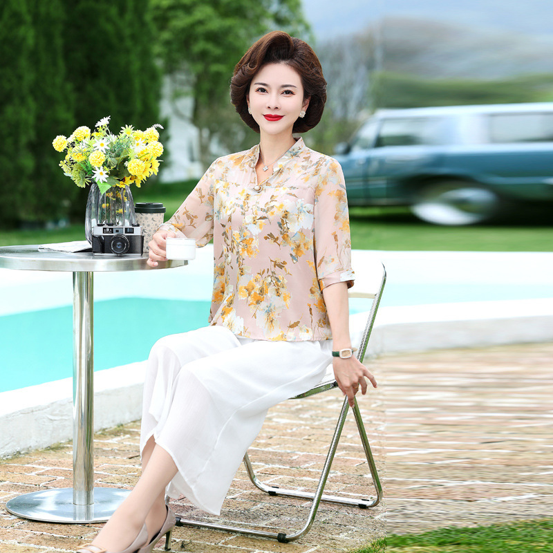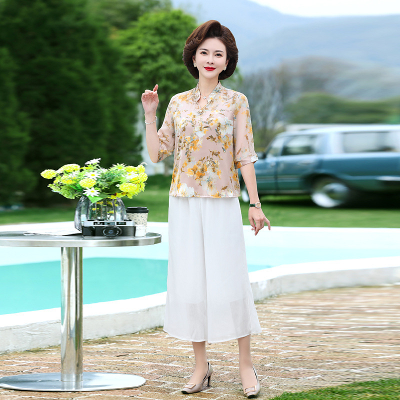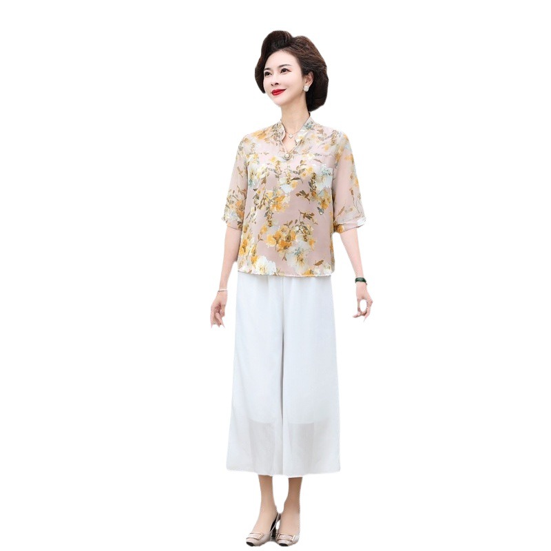 | nameOriginal | Mother's Summer suit Short-sleeved T-shirt Western Chiffon Small Shirt Middle-aged and Elderly Women's Summer Cheongsam Top Clothes Two-piece Set |