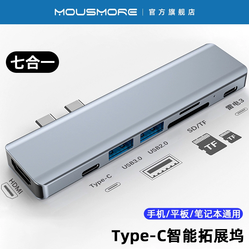mousmore is suitable for Apple macbook notebook dual Type-c expansion dock USB3.0 multi-interface Thunderbolt 3 extender HDMI Huawei mobile phone PD100 two-to-seven aluminum alloy 7-in-2