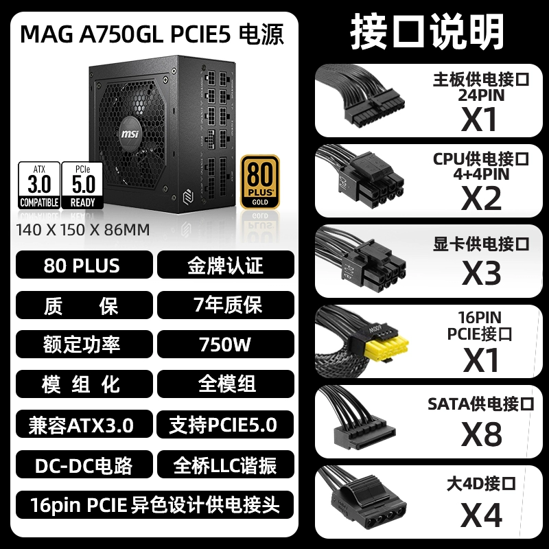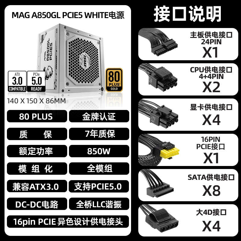 MSI 750W/850W Gold Medal Full Module ATX3.0 White Desktop Computer Graphics Card Motherboard Chassis Power Supply