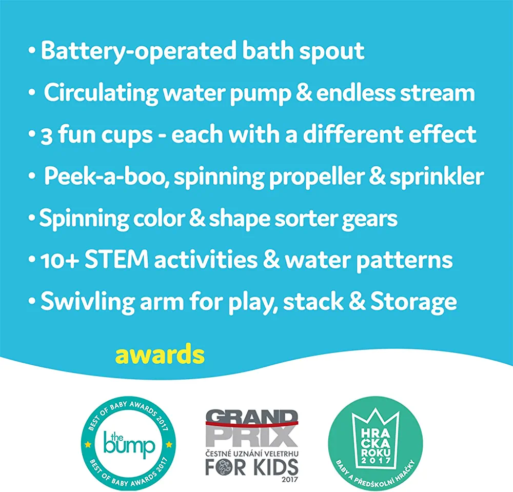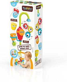 Place the float in the tumbler and fill it with water for a silly and wet game of peek-a-boo. Play & Develop Operating the spout on their own helps develop problem solving skills and exposes children to the principle of cause and effect – from starting and stopping the flow of water, to positioning the tumblers under the flow, and sorting and constructing the gears to spin together. Demonstrate basic principles of physics through the power of water to activate things and create speed and movement – turning the propeller, raising the float, and spinning the gears. Raise concepts like full and empty, heavy and light, and buoyancy. The various colors, the variety of activities, game modes, and surprising water effects ignite your child’s curiosity to explore the product in-depth. It will encourage your child to experiment with it in different ways, stimulating curiosity for the world around them. Physical Development Designed especially for little hands, this put and take play and activating and playing with the spout presents many great opportunities to develop your child’s fine motor skills and strengthen hand-eye coordination – pressing the on/off button, stacking the tumblers, sorting the gears, and more. So many aspects of the spout, tumblers, and gears require and improve hand-eye and limb movement coordination – stacking the tumblers, positioning them under the spout, sorting and assembling the gears, and even dunking the silly float in the tumbler. The Spout’s various flows – the gentle stream, the sprinkle of the tumbler, the splashes of the propeller and spinning gear – promote sensory development. In addition, the colors, movements, and sound of the water create a multisensory experience that encourages meaningful learning. Social & Emotional Development Your child’s sense of humor begins to develop at a very young age. Introduce silliness and fun to bath time with the spout’s big-eyed button and tumblers, the googly-eyed gear, the surprising sprinkler, and the peek-a-boo float. For toddlers, every little win is a huge confidence boost, and the Spin 'N' Sort Spout Pro offers many simple accomplishments that were developed for their precise abilities – from aiming for the water stream and ‘catching’ it with the tumblers, to stacking the cups. Bath time with the Spin ‘N’ Sort Spout Pro can be an opportunity to improve communication and language skills – name the colors, describe actions, even order ‘a cup of tea’ in a tumbler then laugh when the water pours out before you even receive it. |