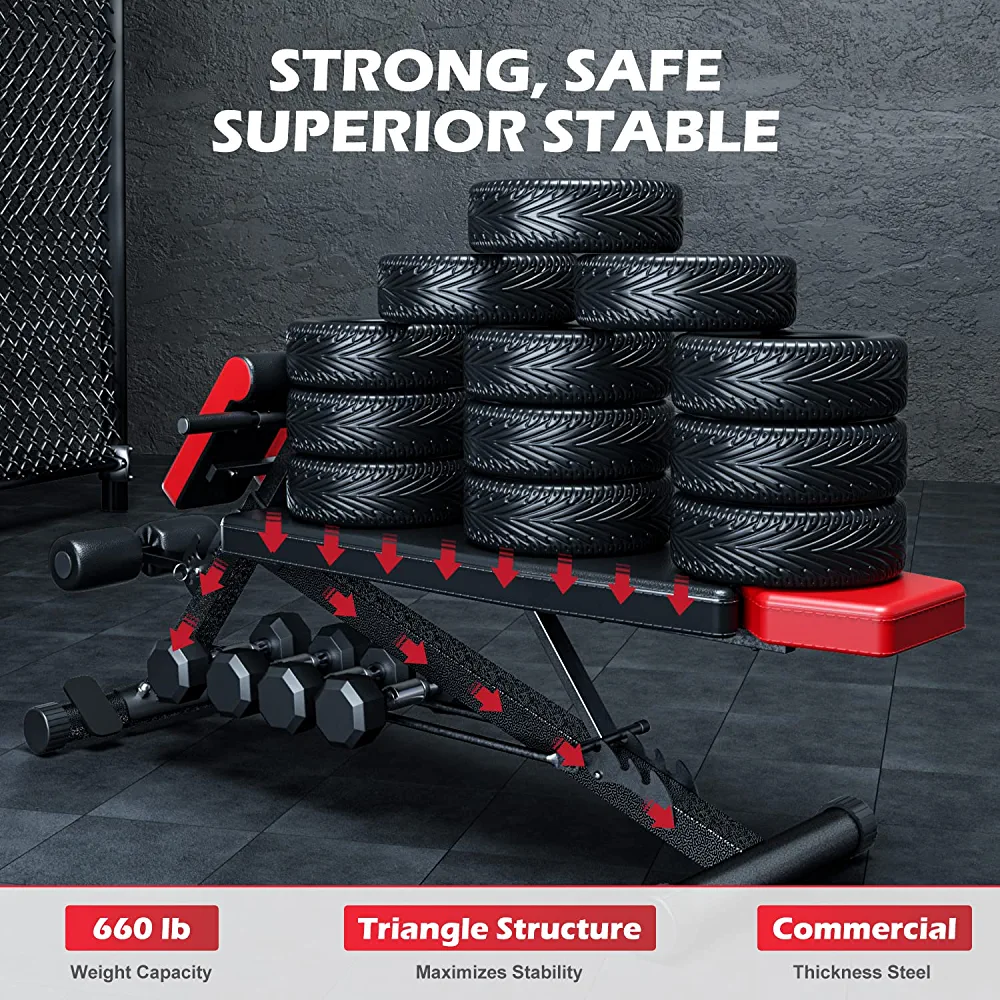 Crafted from high-grade steel, this strength training bench is built to withstand even the toughest workouts, ensuring that you can lift with confidence. The triangular base support and 3-inch thick cushion pad provide both comfort and stability, making it a superior choice to most gym equipment for home use.