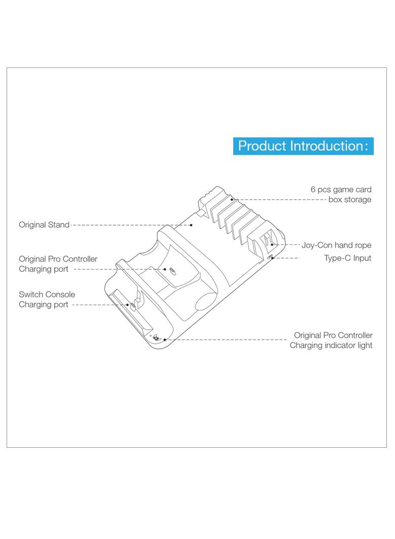 Multi-functional design,built in 1 switch console and 6 game card storage slots.Charge your switch Pro controller and Switch console at the same time.