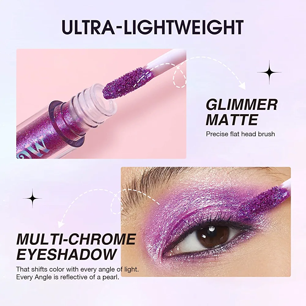 Introducing our Multichrome Liquid Eyeshadow, a stunning product that changes color with every angle of light. The reflective pearl finish creates a glittery and shimmery effect that highlights your eye contour and makes you the center of attention at any event.