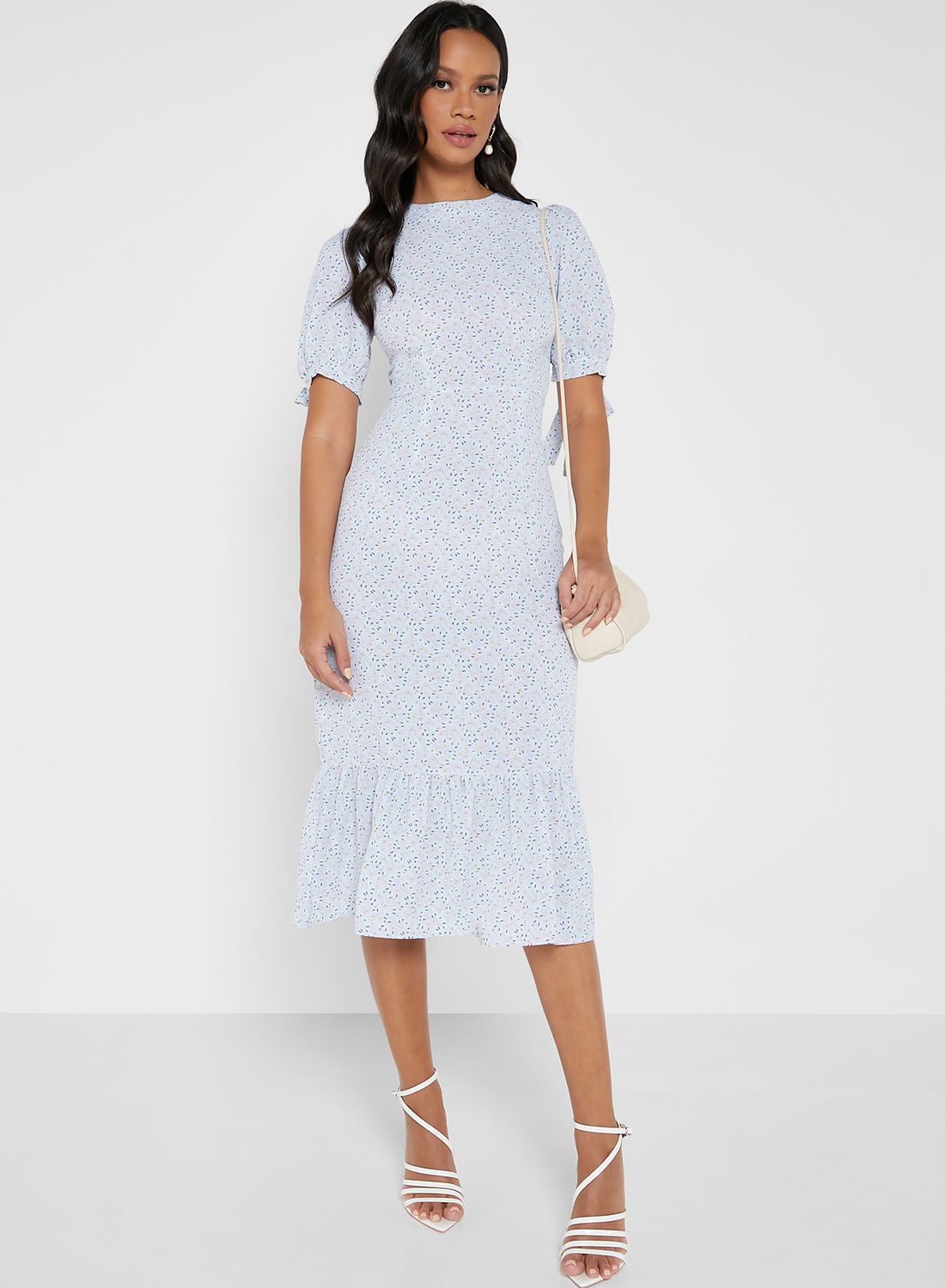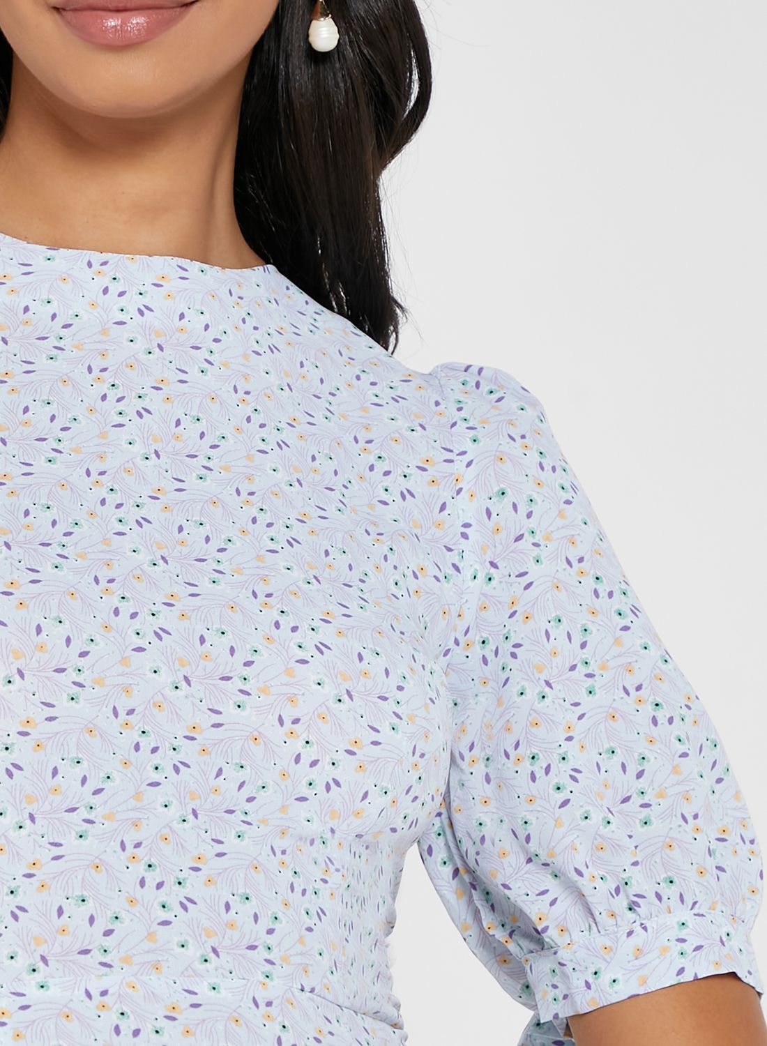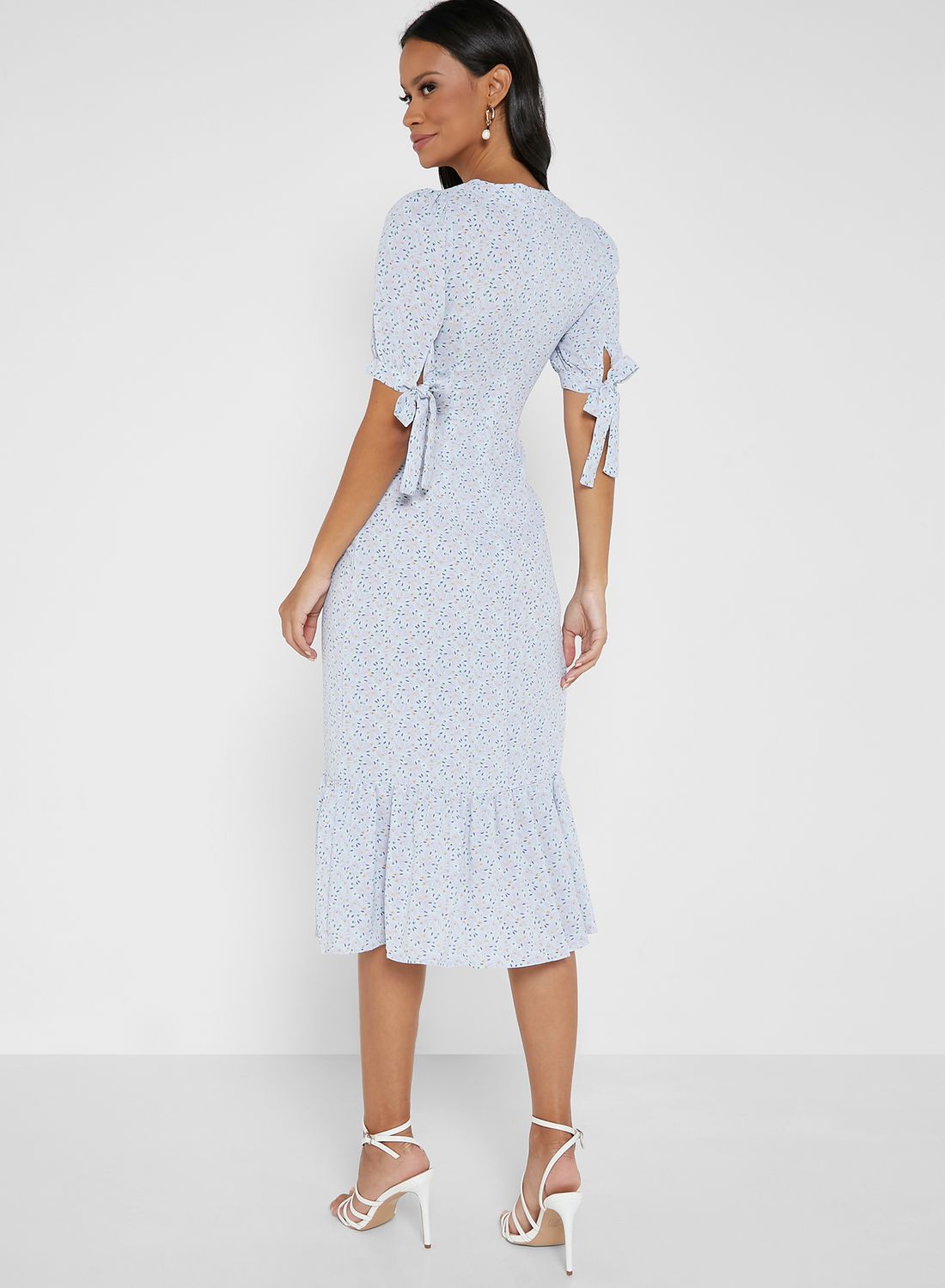 This product features a lightweight and flowy polyester fabric that is comfortable to wear. It has a beautiful contrast floral print all over, and comes with a round neck and short sleeves that have tie-up straps. The reverse side has a secure zipper closure, and the ruffle hem style adds a touch of elegance to the overall design.