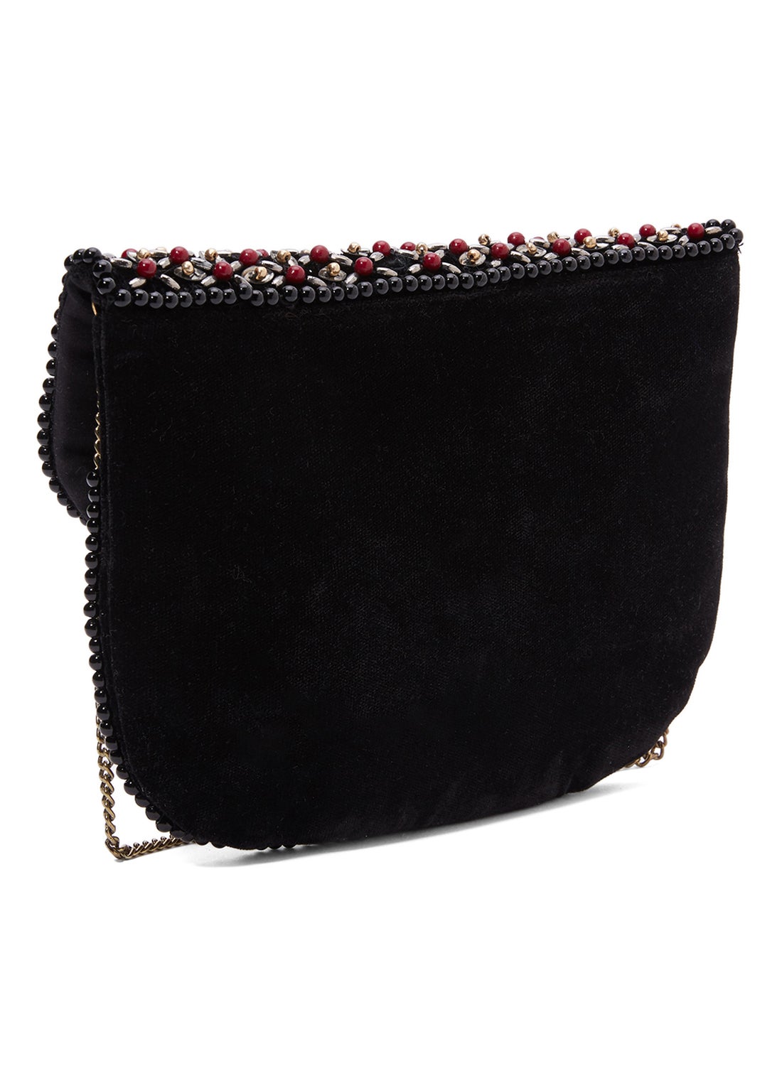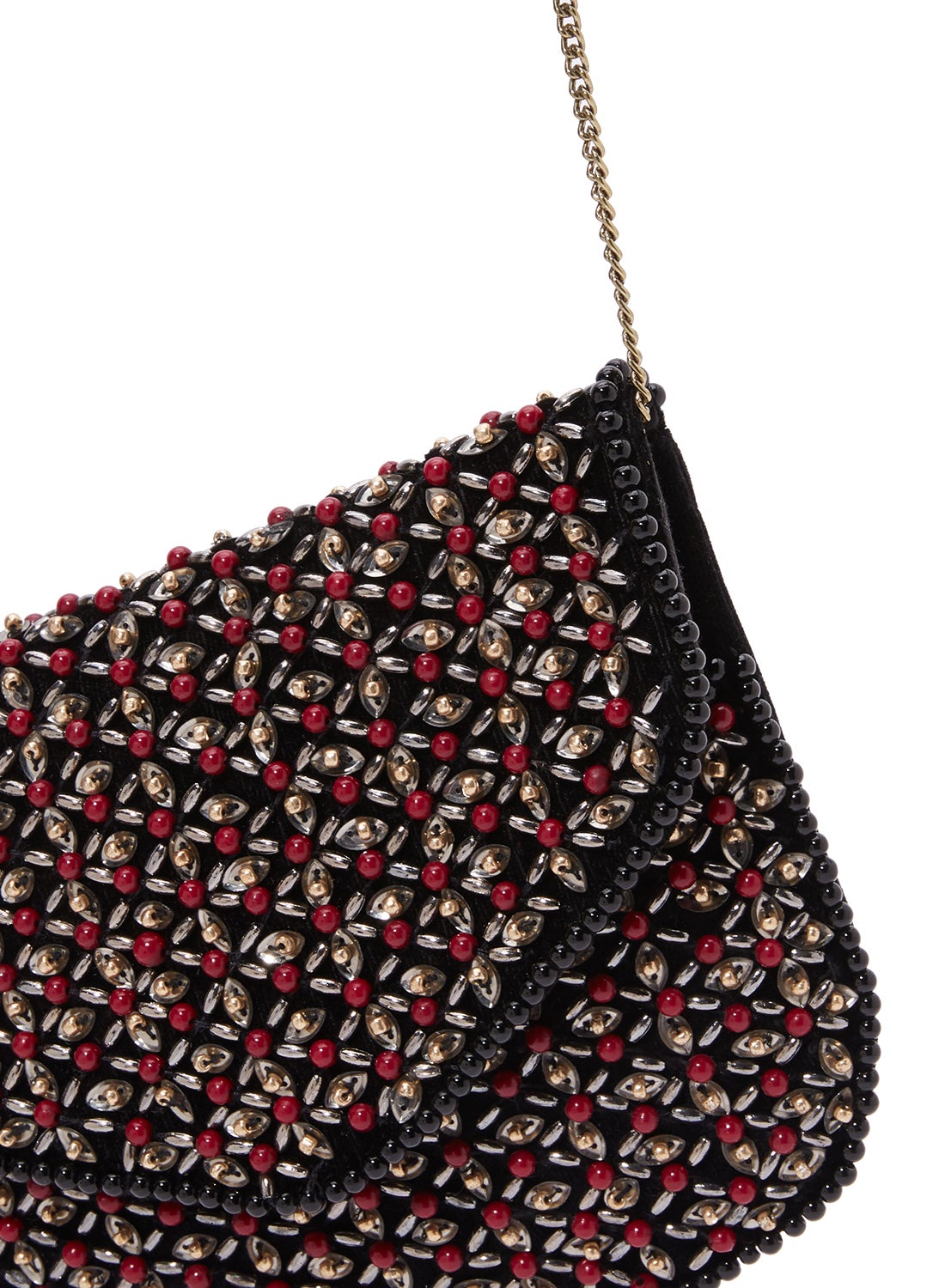 This product features a stunning bead design that covers the entire surface. It also comes with a crossbody strap made of gold chain for added elegance. The flap is secured with a magnetic button closure for easy access.