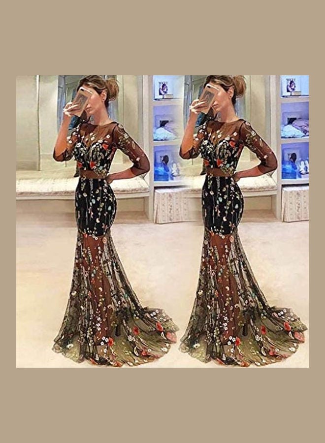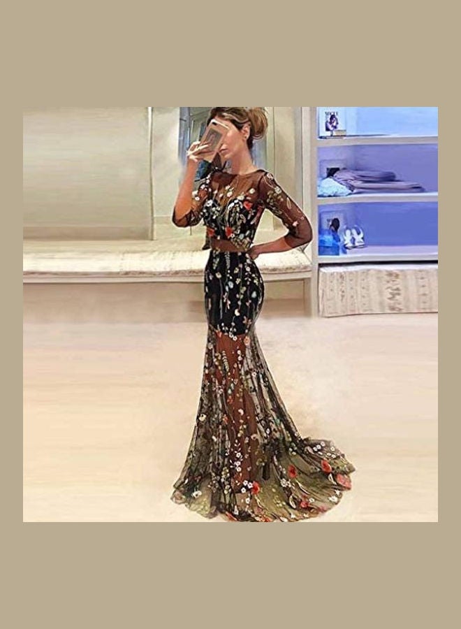 Multicolored deep V-back long dress with half sleeves for women’s cocktail, prom, or bridal wear.