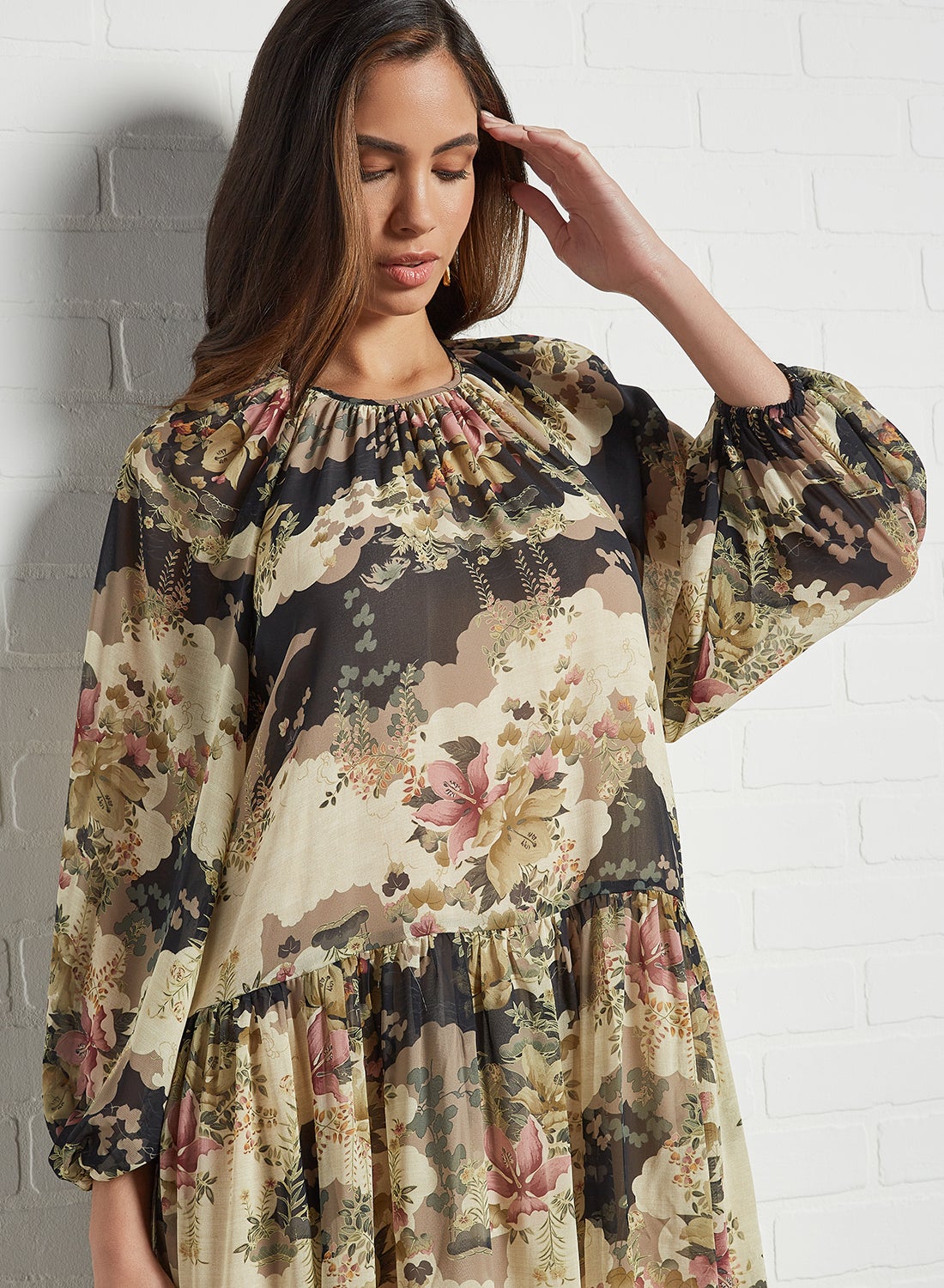 Achieve a chic appearance by pairing these boots with this product. It features a round neckline and long sleeves, with an all-over floral print that adds a touch of elegance. The relaxed fit and midi length provide comfort and style. Made from 100% polyester, this product is easy to care for by following the instructions on the care label. The model is 177cm tall and wears a size S.