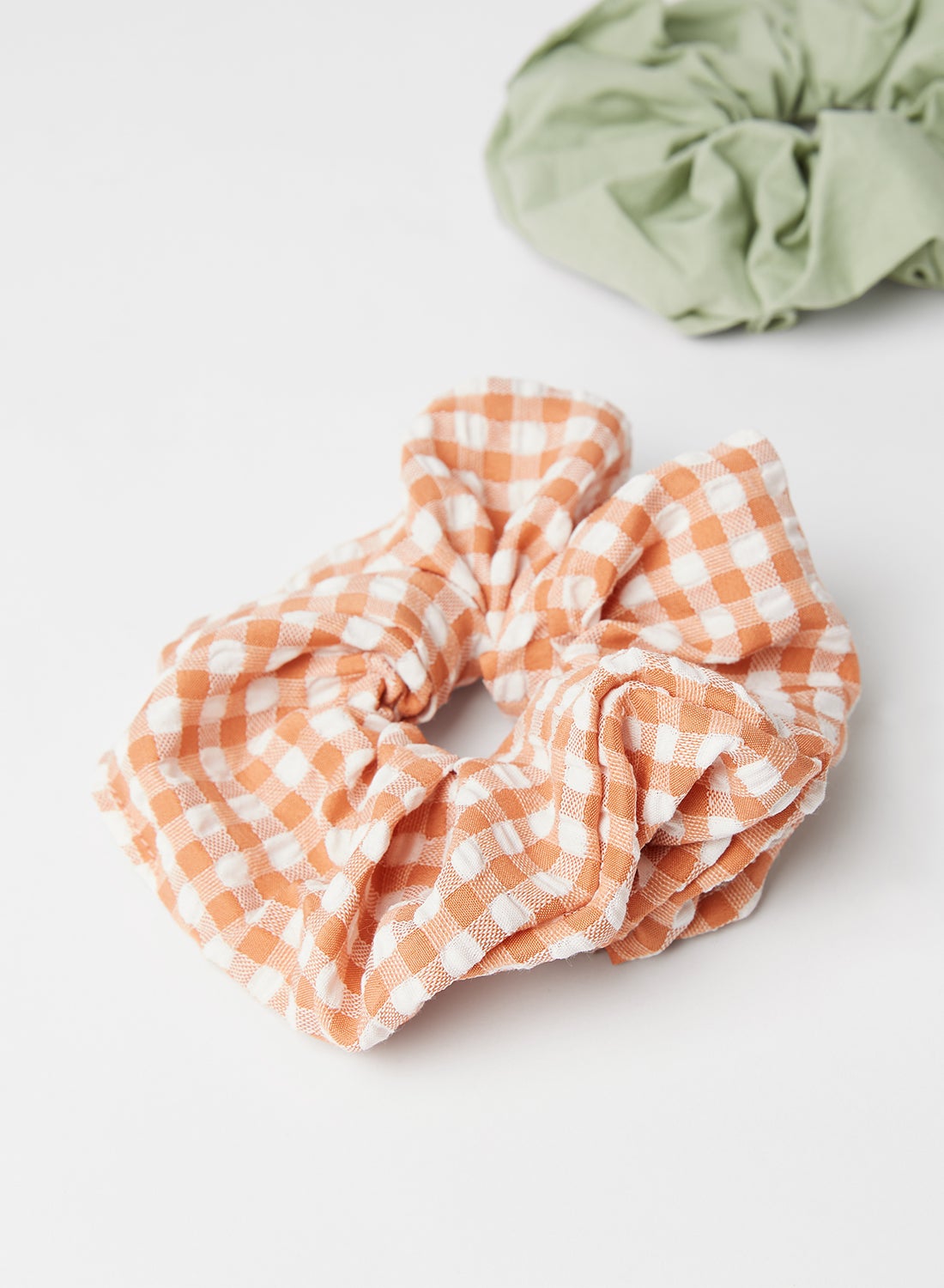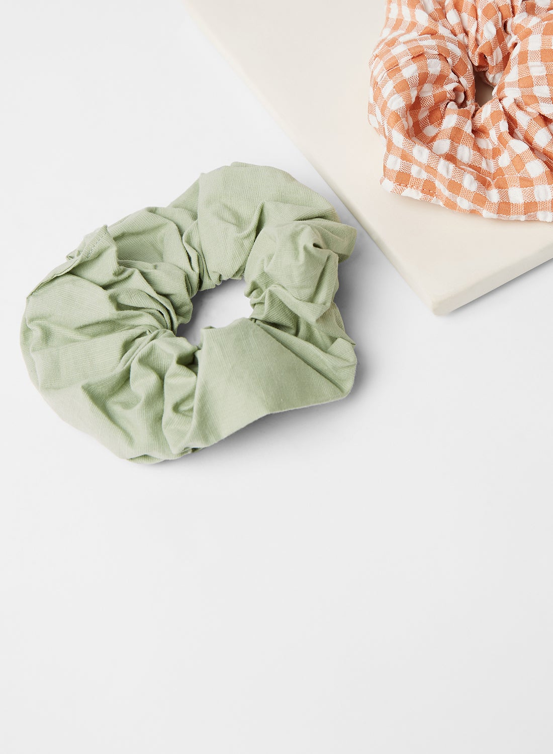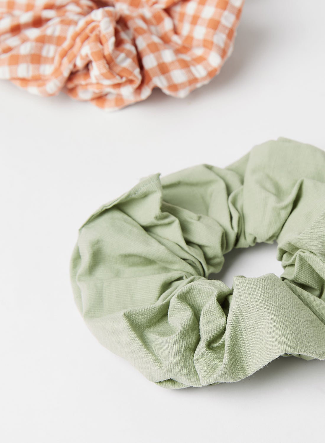 This product is a set of two scrunchies that are crafted from a gentle cotton material. The pack includes one scrunchie in a solid color and another in a charming gingham print. The elastic band ensures a snug and secure fit. Please follow the care label instructions when washing.