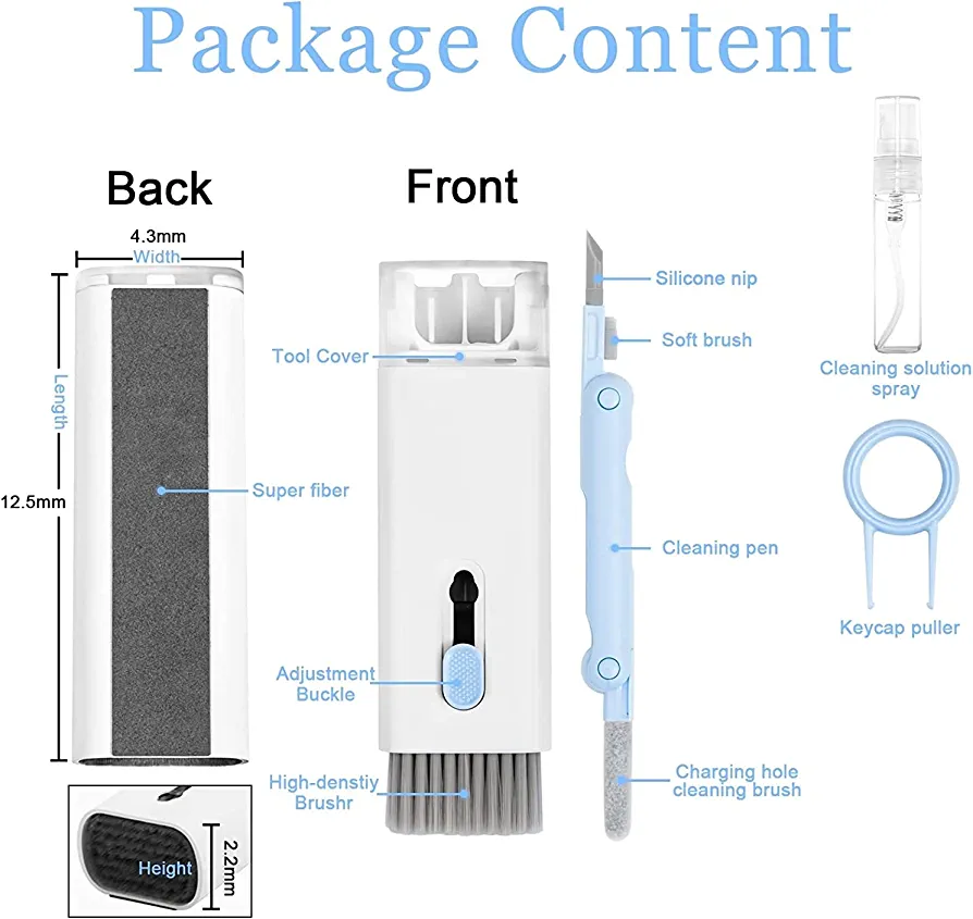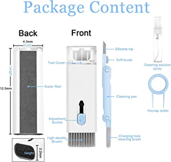 Introducing the 7-in-1 Electronics Cleaner Kit, the ultimate solution for keeping your electronic devices clean and free from dust and dirt. This Keyboard Cleaner Kit is a portable and multifunctional cleaning tool that can be used on a variety of devices including PC monitors, Airpods, Airpods pro, cell phones, laptops, computers, and Bluetooth earphones. The kit comes in a sleek white and blue design that is both stylish and functional. With seven different cleaning tools included, you can easily clean every nook and cranny of your devices. The kit is easy to use and can be carried with you wherever you go, making it the perfect accessory for anyone who wants to keep their electronics looking and functioning like new. Say goodbye to dirty screens and keyboards and hello to a cleaner, more efficient electronic experience with the 7-in-1 Electronics Cleaner Kit.