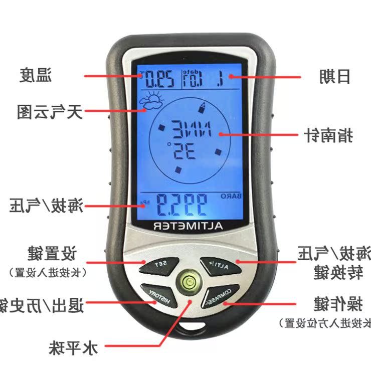 | nameOriginal | Multifunctional mountaineering skydiving skiing palm altimeter altitude meter outdoor air pressure compass level thermometer |