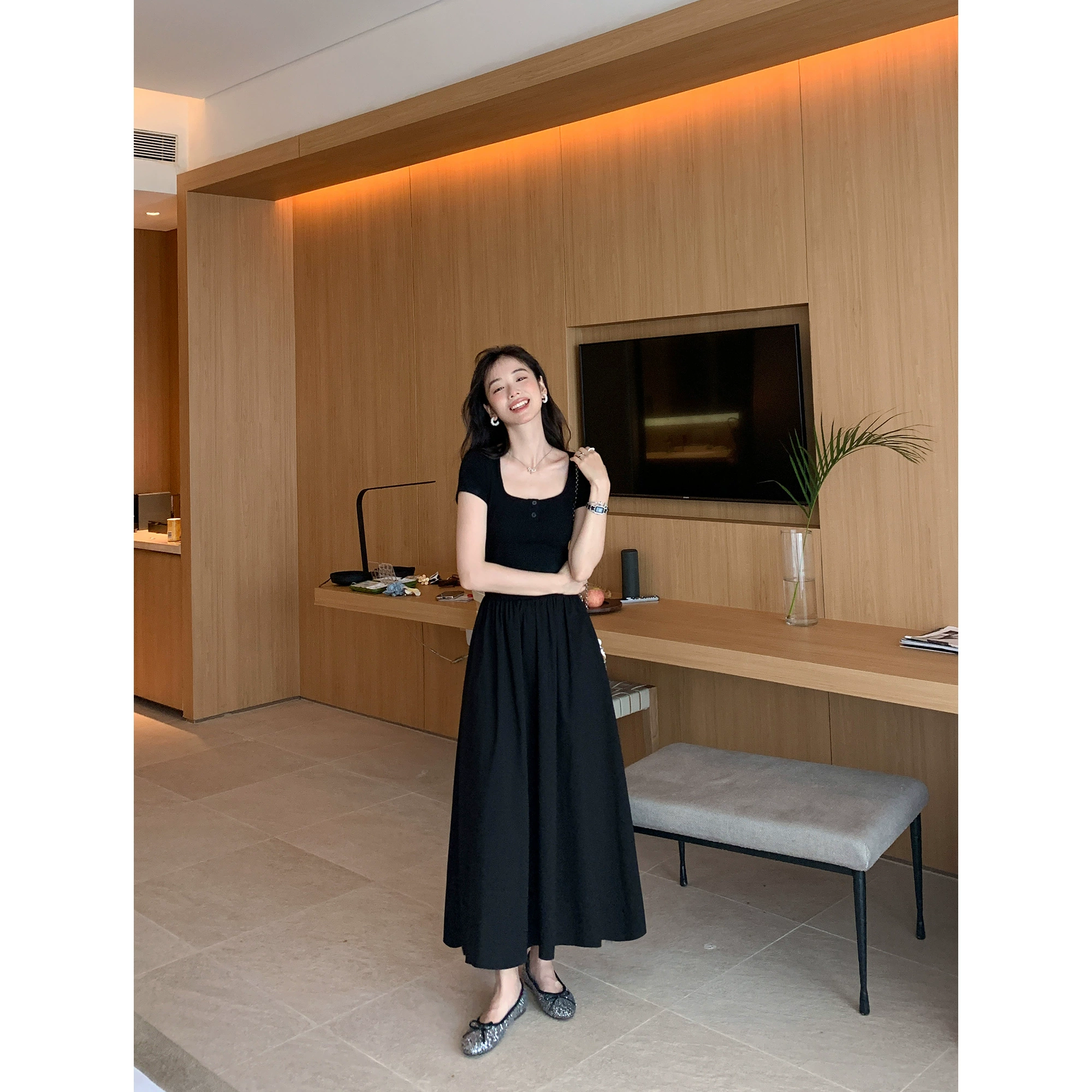 | nameOriginal | MULVAN white square neck short-sleeved dress for women, high-end, waist-slimming, slimming A-line knitted splicing long skirt |