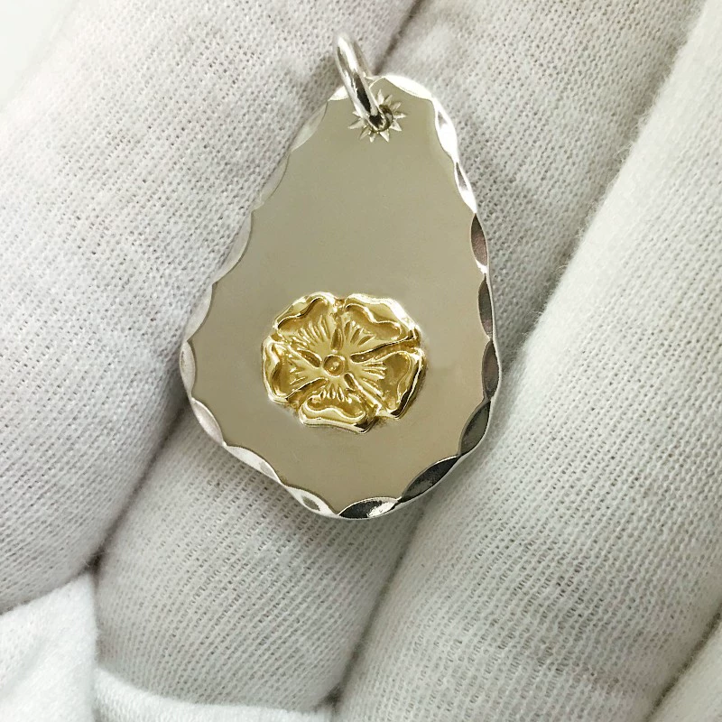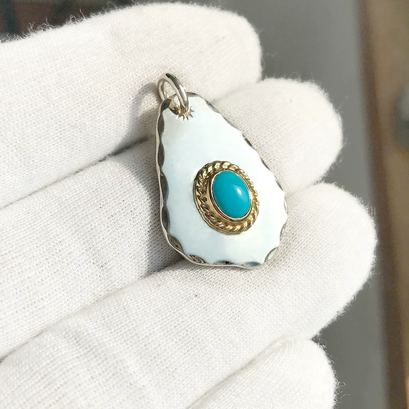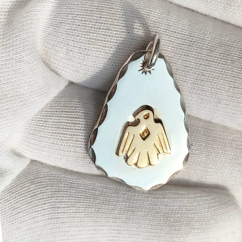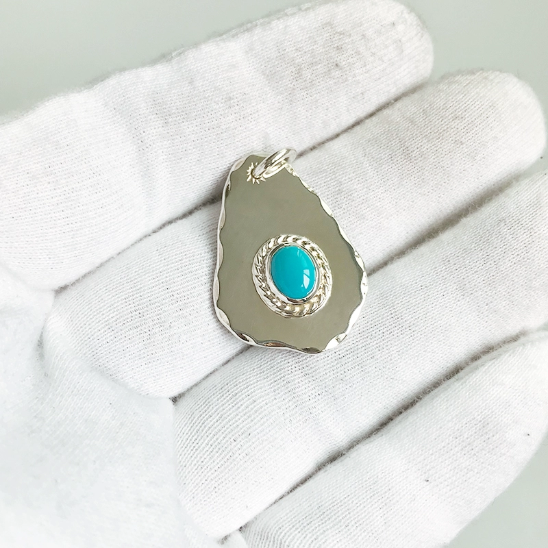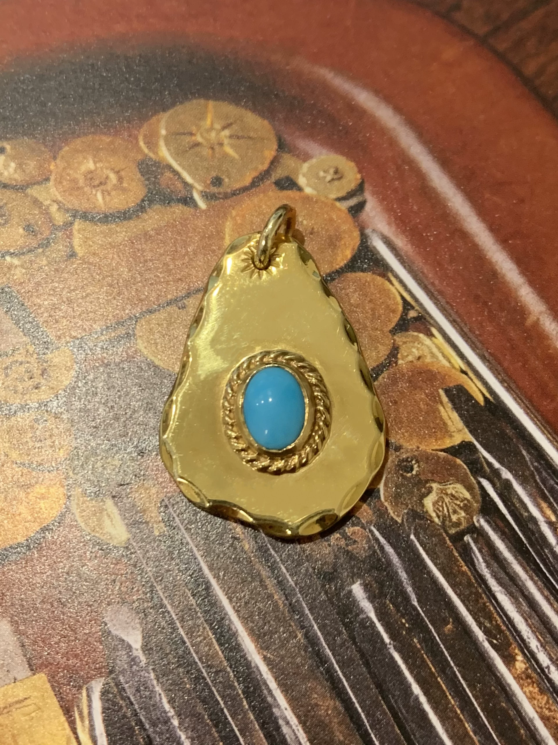 | nameOriginal | Mustang Manor goros Takahashi Feather Goro style cut edge thunderbird rose flower gold rope turquoise silver cake pendant |