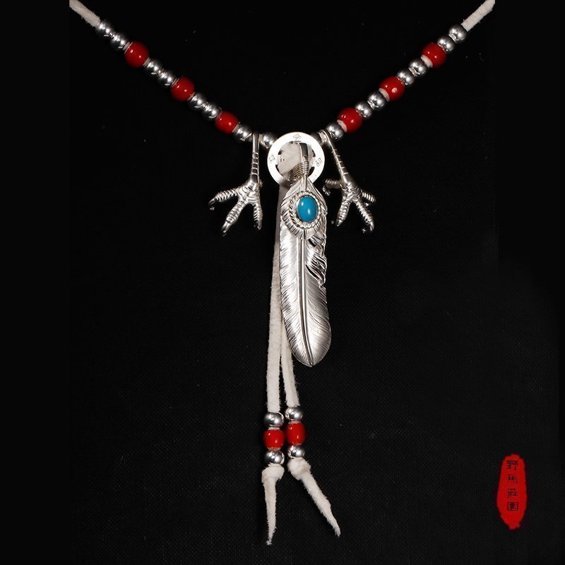 | nameOriginal | Mustang Manor Takahashi Hagoro style turquoise silver feather pendant eagle claw glass bead necklace set |