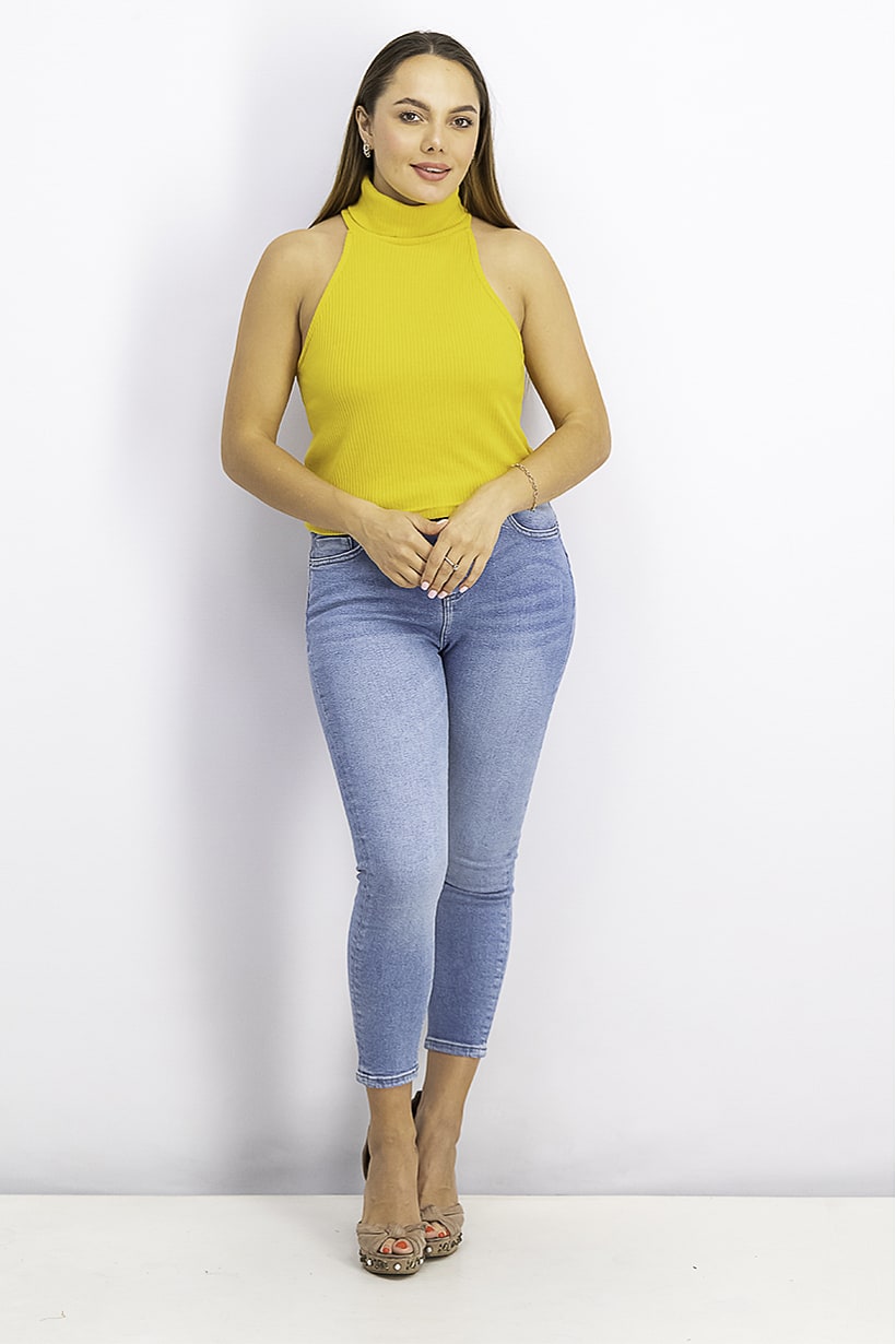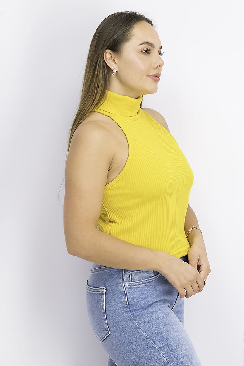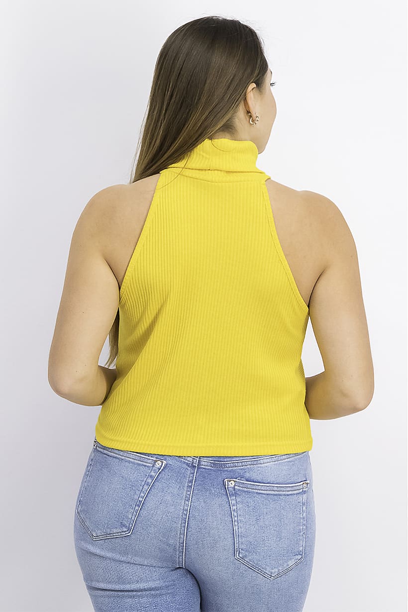 Mustard Sleeveless Textured Turtle Neck Top for Women.