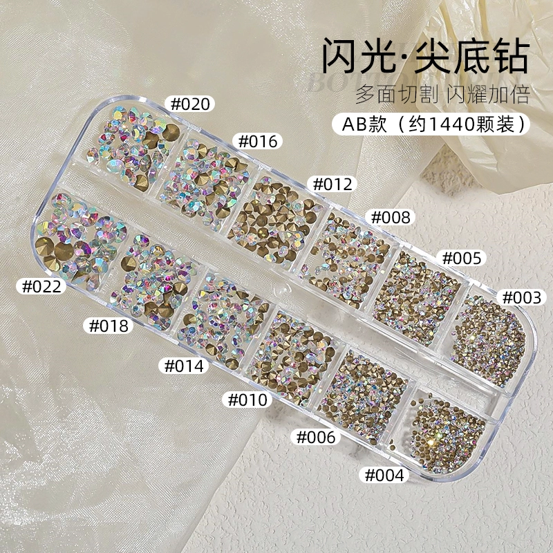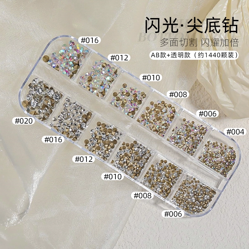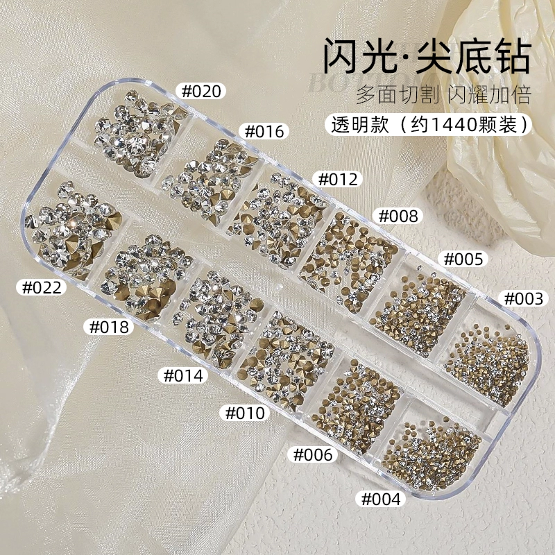 | nameOriginal | Nail art jewelry Internet celebrity hot model pointed bottom diamond transparent illusion 12 grid pile diamond Austrian diamond Czech rhinestone jewelry mixed model |