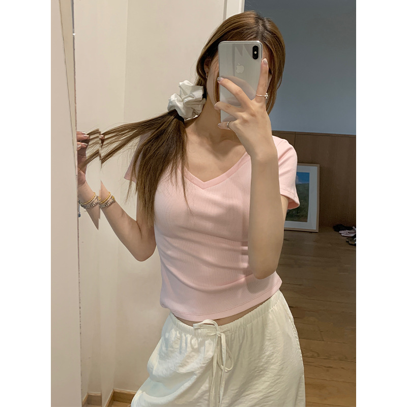 Nantao Pure Desire Threaded V-neck Shoulder Short-sleeved T-shirt Women’s 2024 Summer Thin Niche Spice Girls Slim-fit Knitted Top
