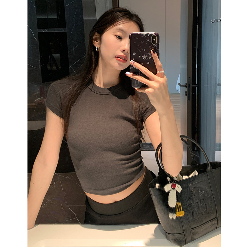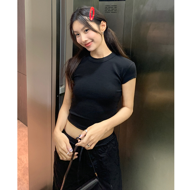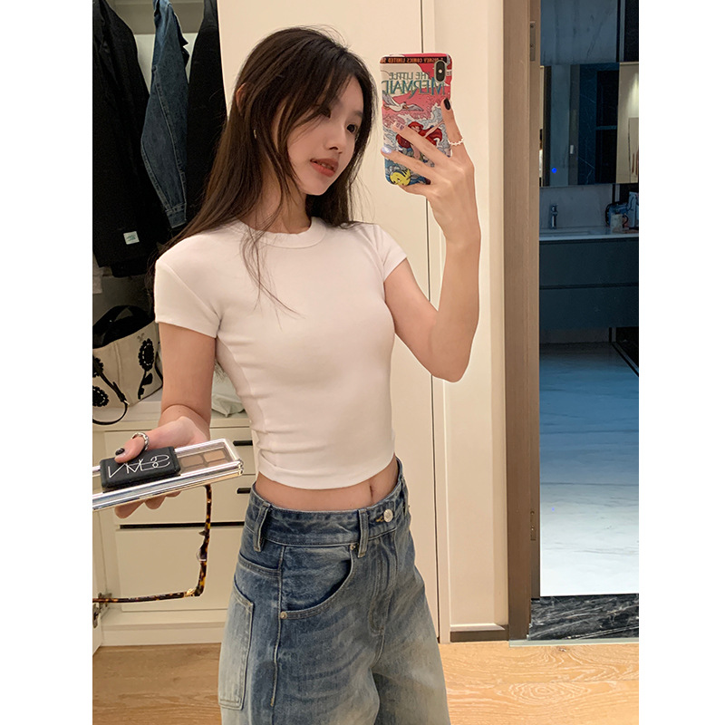 Nantao Spice Girls Shoulder T-Shirt Women’s 2024 Summer New Short Versatile Crewneck Pullover Navel-exposed Tight Short Sleeve