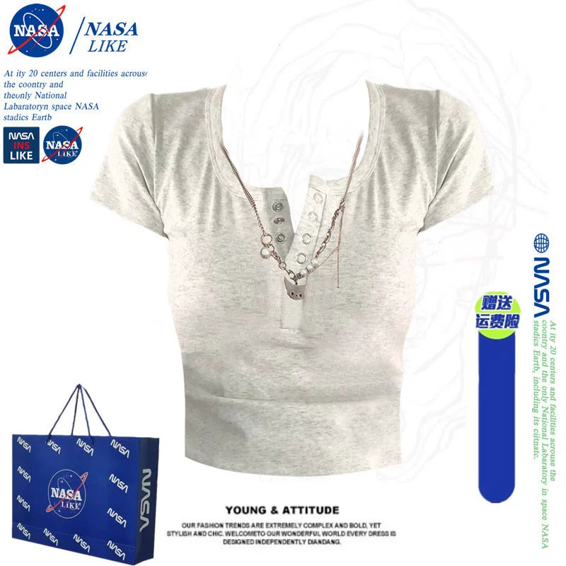 | nameOriginal | NASA American shoulder U-neck short-sleeved T-shirt women's summer design slimming Hong Kong style chic hot girl short top |