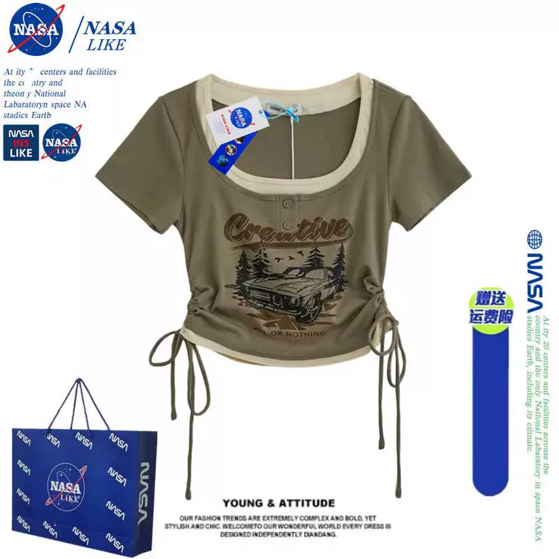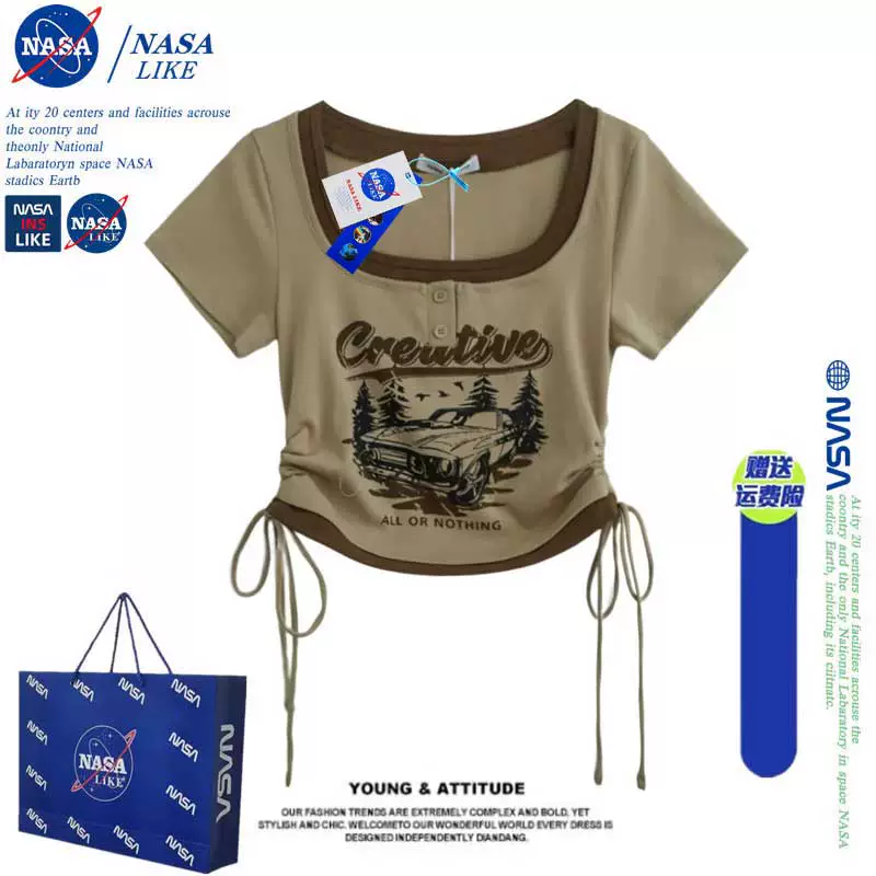 | nameOriginal | NASA large size American retro right-shoulder T-shirt short-sleeved summer hot girl short drawstring fat slimming belly-covering top |