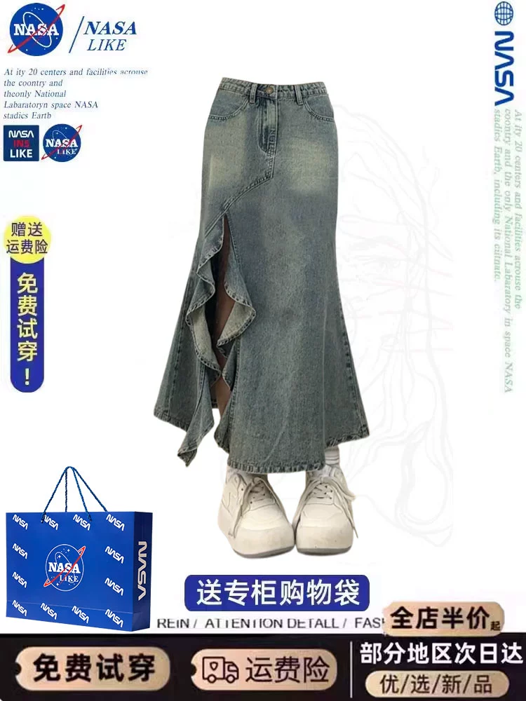 NASA large size irregular medium long denim skirt