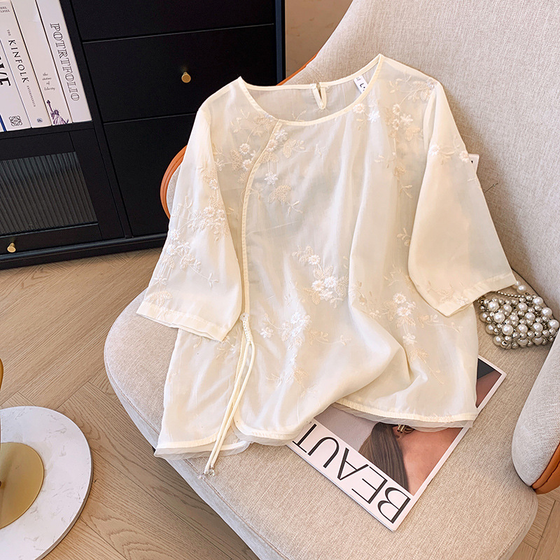 | nameOriginal | National Style Chinese Button Jacquard Five-point Sleeve Shirt Women's Summer New Zen Slant Crewneck Shirt Loose Top |