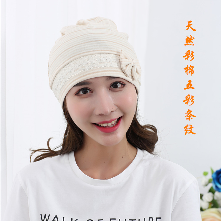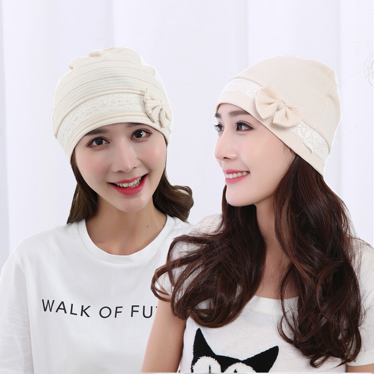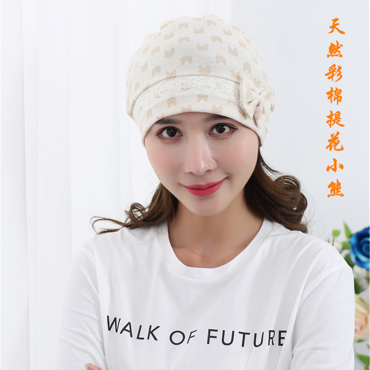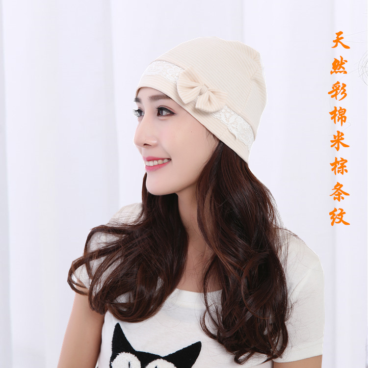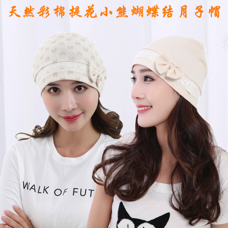 | nameOriginal | Natural colored cotton bow confinement cap pure cotton jacquard bear maternity hat striped Four Seasons maternity hat  |