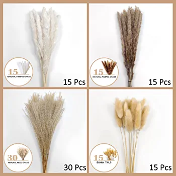 【NATURAL PAMPAS DECORATION】Come with 75 luxuriant and lush pampas plants, including 15 Pcs white pampas,15 Pcs brown pampas,15 Pcs Bunny Tails Pampas Grass, and 30Pcs Reed Grass.