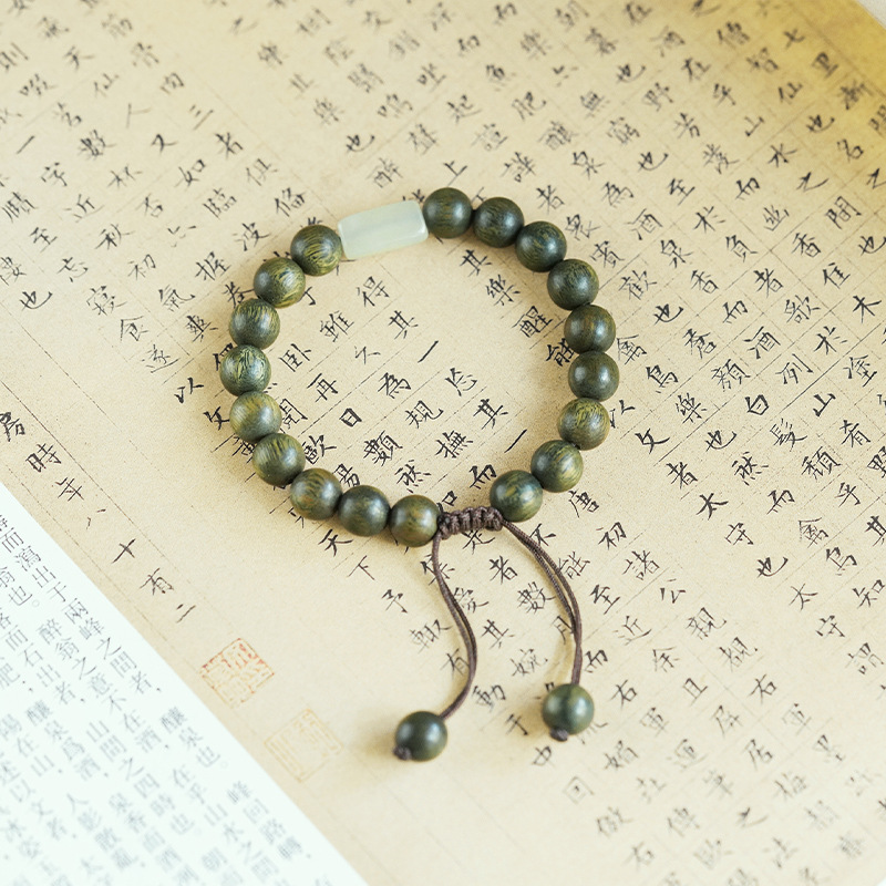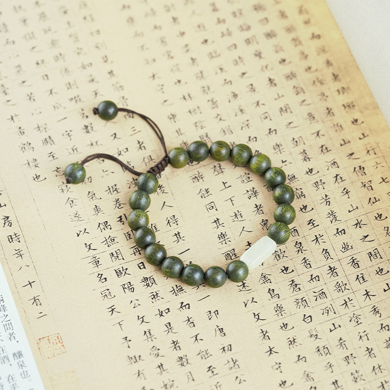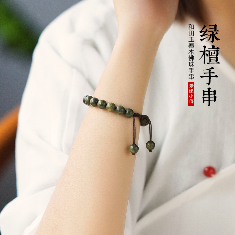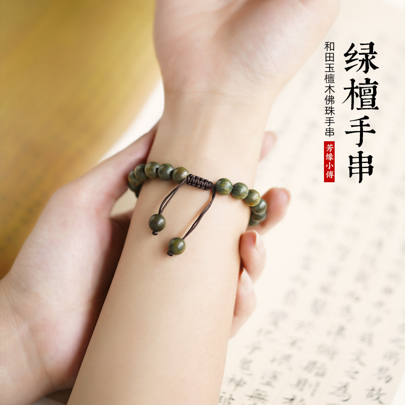 Natural Green Sandalwood Buddha Beads Bracelet Old Material Hetian Jade Sandalwood Bracelet for Men and Women Ethnic Jewelry Bracelet Chinese Style