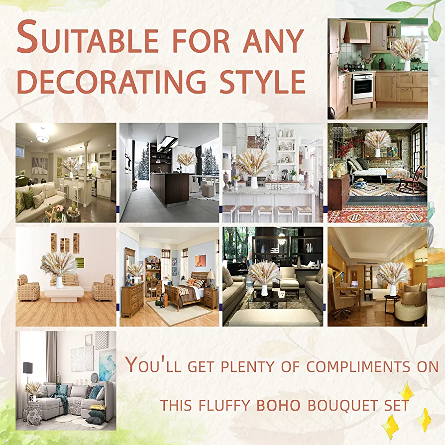 Introducing our 82PCS Natural Pampas Grass Bouquet, a stunning addition to any home or event. This versatile bouquet of dried pampas grass adds a touch of elegance to your decor, whether it’s for a wedding, centerpiece, or floating shelves. Elevate your special event with our elegant pampas drass bouquet, perfect for boho or western wedding decor. Our dried pampas for decor creates a radiant atmosphere, complementing your centerpiece table decorations and coffee table decor with natural beauty. Impress your guests with our eye-catching pampas decorativas in vase, perfect for gold entrance tables, everyday centerpieces, or entryway decor.