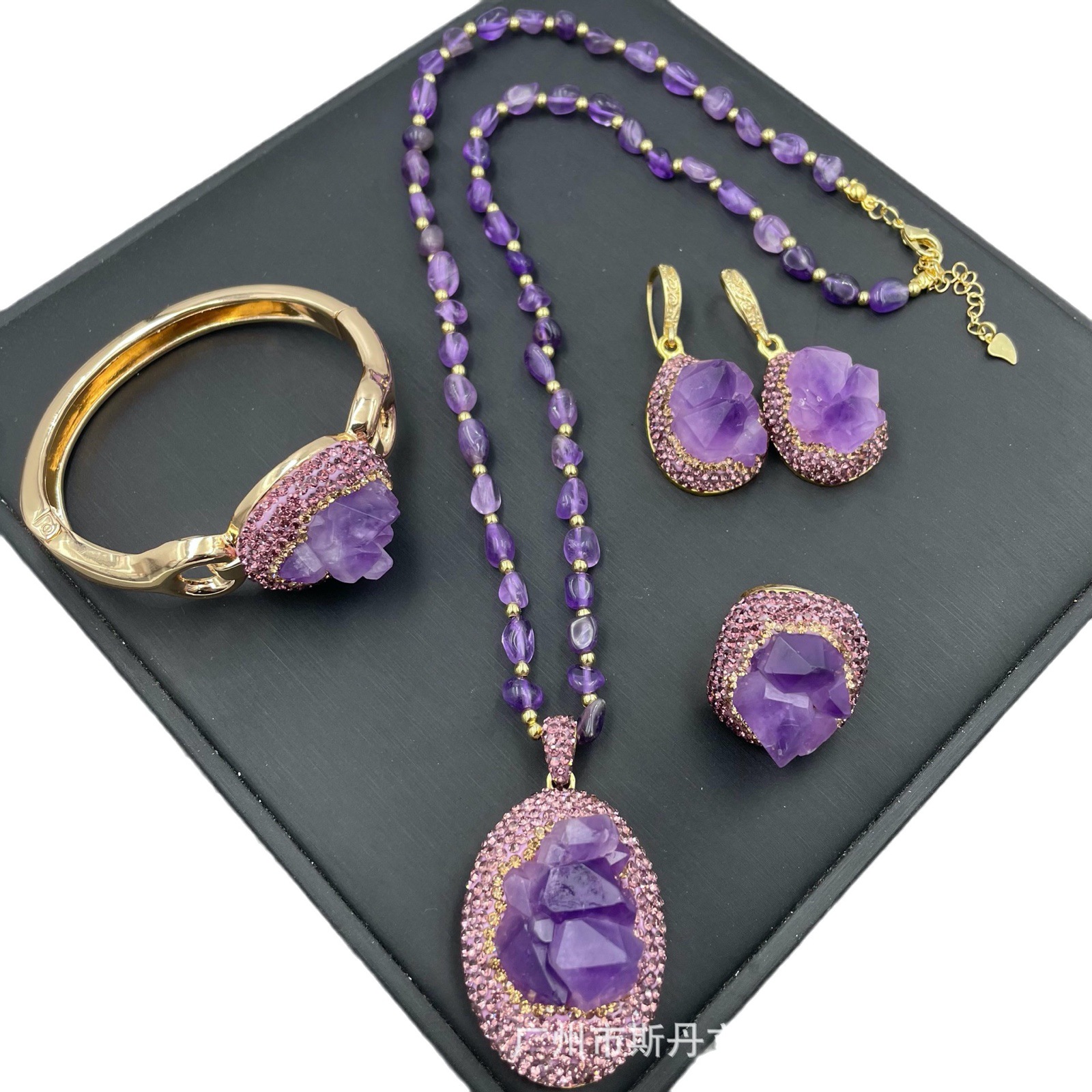 | nameOriginal | Natural raw stone amethyst flower four-piece set European and American style personalized raw ore jewelry sweater chain high-end handmade suit |