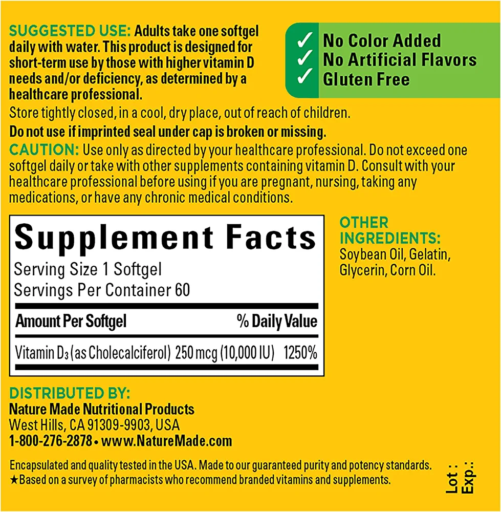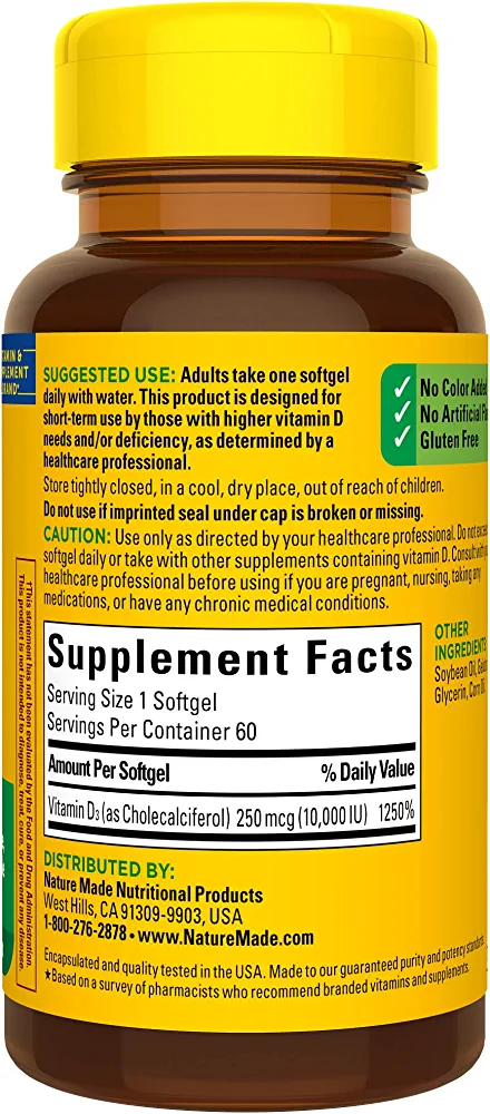 | descriptionOriginal | Description Nature Made Maximum Strength Vitamin D3 10000 IU Softgels (250 mcg) offer an easy way to add Vitamin D supplements to your daily routine to support bone, teeth, muscle, and immune health. Sourced from high quality ingredients, these Nature Made Vitamin D softgels are gluten free dietary supplements with no color added and no artificial flavors. Each Vitamin D3 10000IU softgel supports a healthy immune response and aids in calcium absorption. Vitamin D is a common nutrient shortfall. D3 vitamin is the body’s preferred form of Vitamin D to help maintain Vit D levels. These maximum strength Nature Made Vitamin D3 supplements contain 250mcg (10000 IU) of Vit D3, and are designed for short-term use by those with higher Vitamin D needs and/or deficiency, as determined by a healthcare professional (1). Adults, take one Vitamin D3 Nature Made softgel daily with water. This Nature Made Vitamin D supplement is quality you can trust. (1)Approximately 29% of U.S. adults are Vitamin D deficient (<50 nmol/L) *Based on a survey of pharmacists who recommend branded vitamins and supplements. |