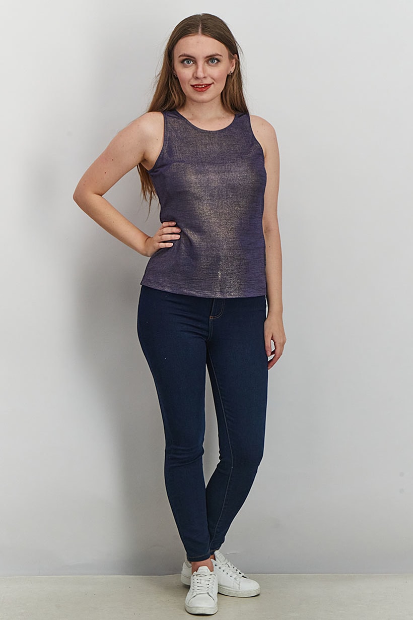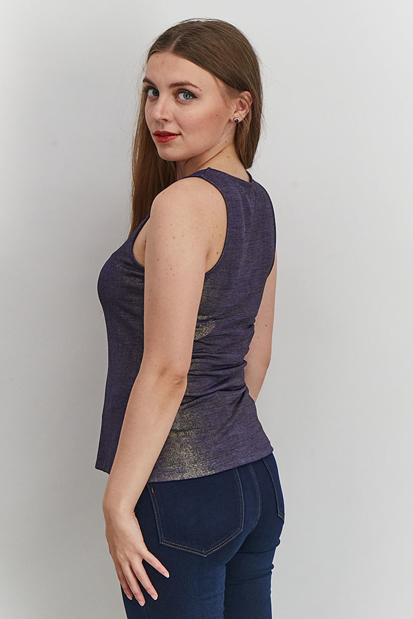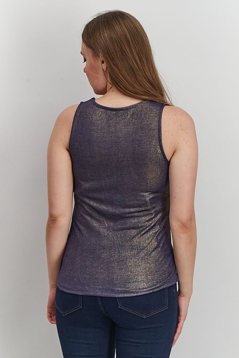 Care : Machine washable, Fit : Regular fit, Size shown : International, Top Style : Tank Top, Types of Hem : Straight hem, Types of Neckline & Collar : U-neckline, Types of Sleeve : Sleeveless, Disclaimer : Product color may slightly vary due to photographic lighting sources or your monitor settings., Fabrics : 100% Polyester, Occasion : Casual, Pattern & Print : Metallic, Types of Closures : Pullover, Color Family : Navy Blue,
