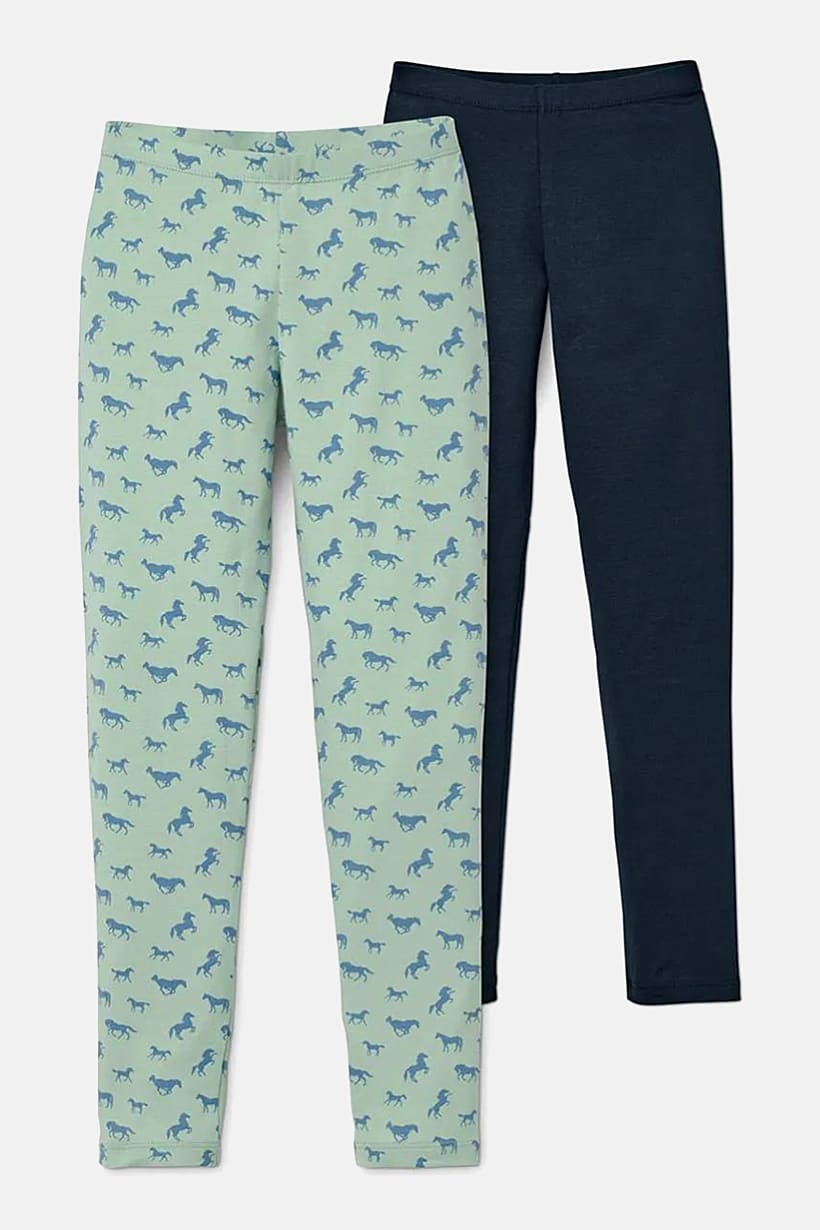 Girls Fashion, Girls Leggings & Tights, kids girl 2 pcs allover print and plain leggings navy and mint