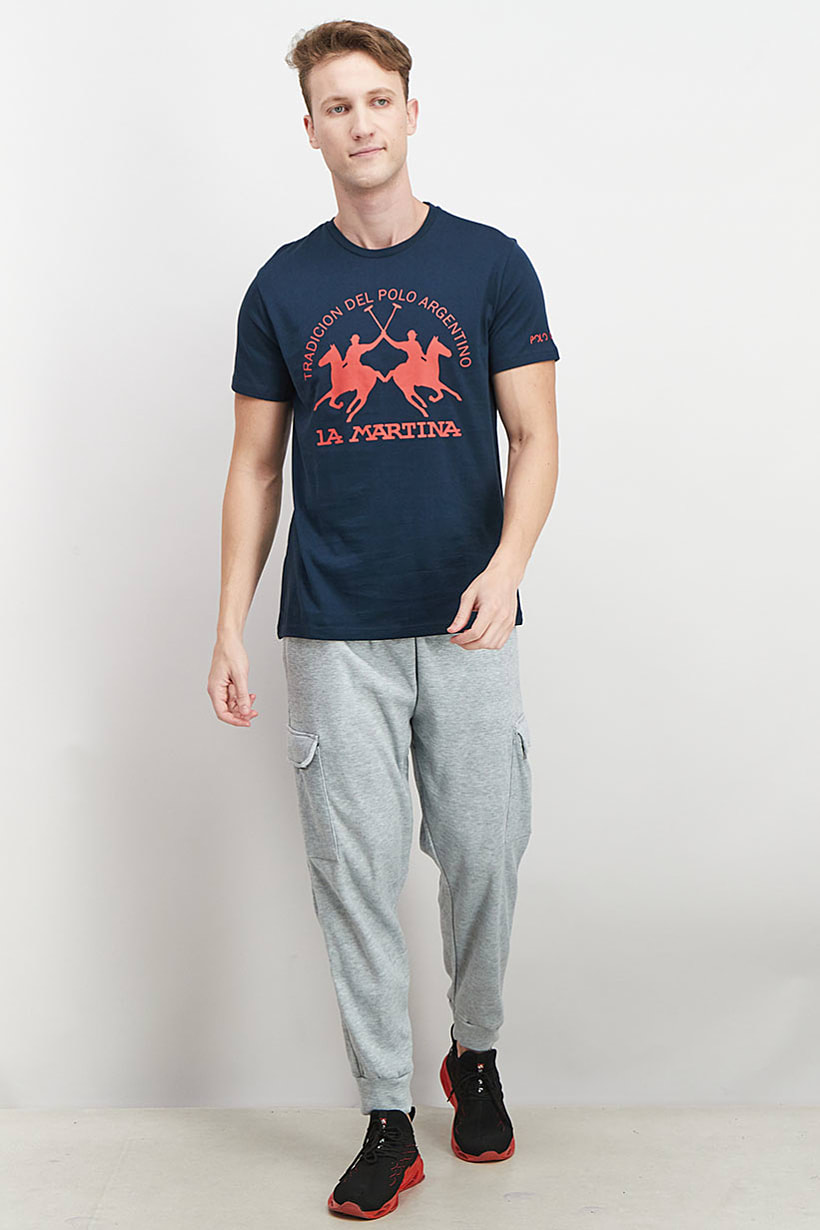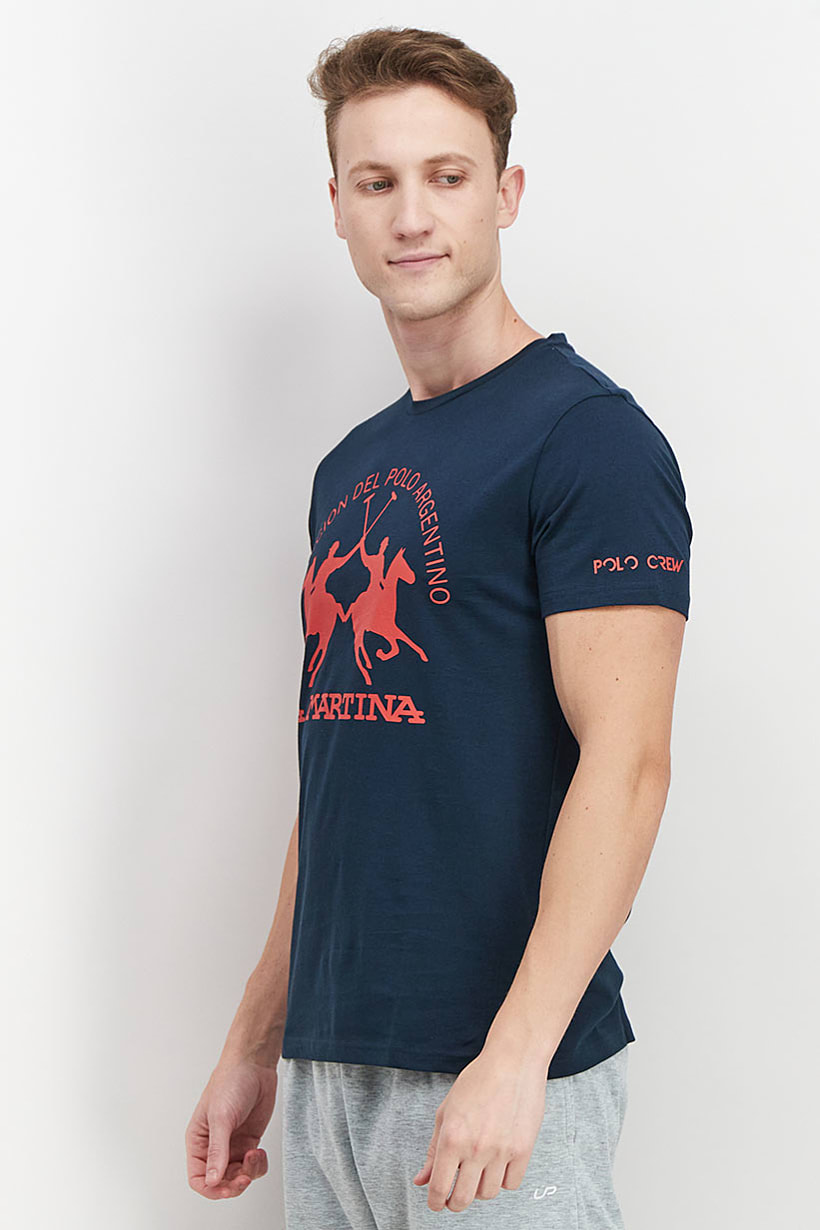 Navy and Poppy Red Graphic Print T-shirt for Men with Crew Neck and Short Sleeves.