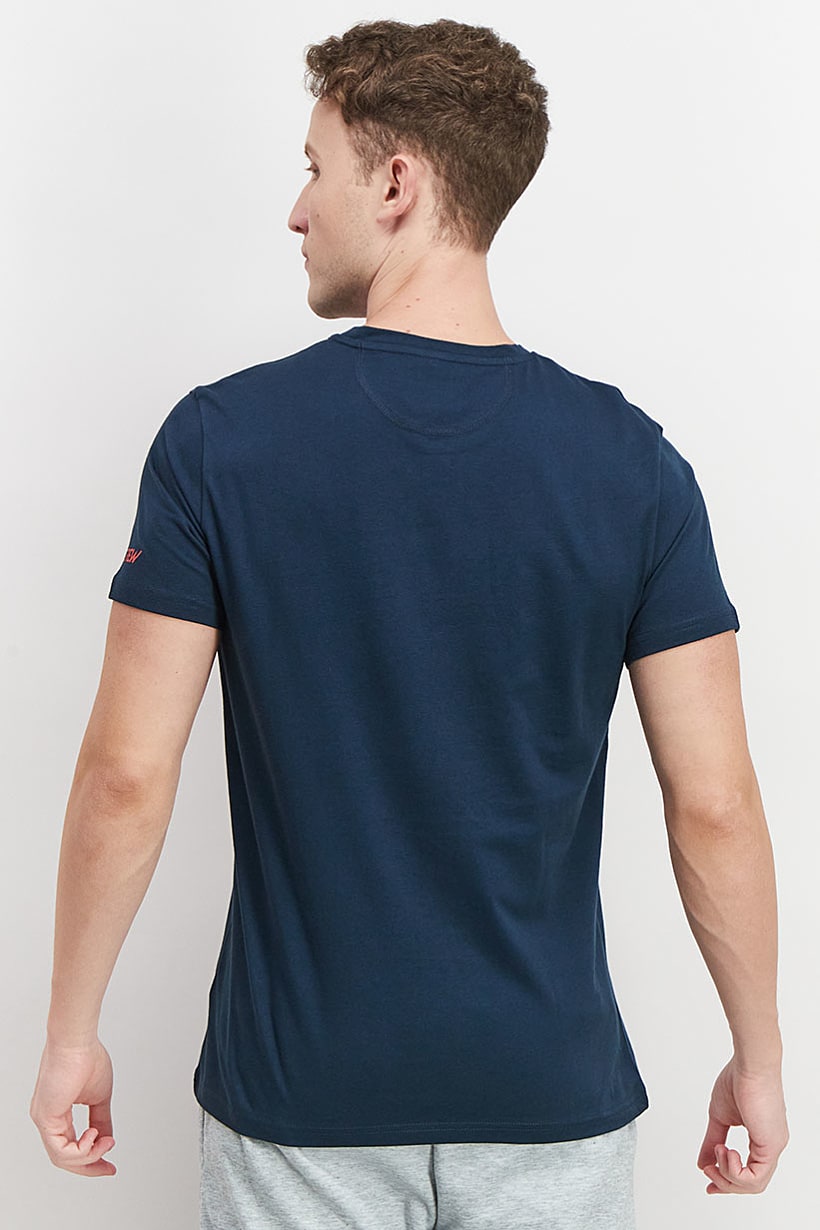 Care : Machine washable, Fit : Regular fit, Size shown : International, Sleeve Length : Short Sleeve, T-Shirt Style : Crew Neck, Type of Hem : Straight hem , Type of Neckline & Collar : Crew neckline , Disclaimer : Product color may slightly vary due to photographic lighting sources or your monitor settings., Fabrics : 100% Cotton, Occasion : Casual, Pattern & Print : Graphic print, Types of Closures : Pullover, Color Family : Navy Blue,