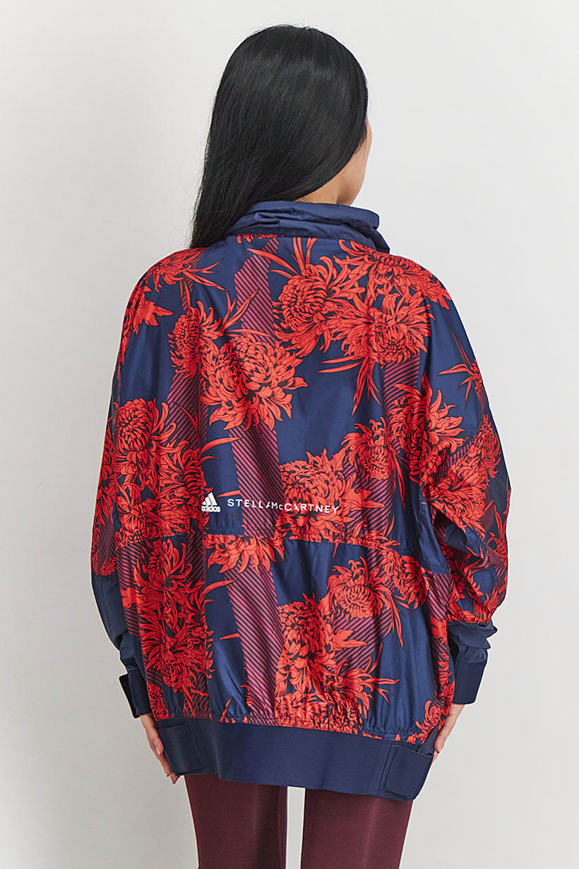 This product is recommended for hand washing and has a sportswear fit. The size shown is Asian and the thickness is light, making it suitable for training. Please note that the product color may appear slightly different due to photographic lighting sources or monitor settings. The jacket is made of 100% recycled polyester and features a graphic print. It is ideal for sports occasions and is available in navy blue and red.
