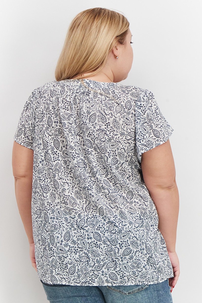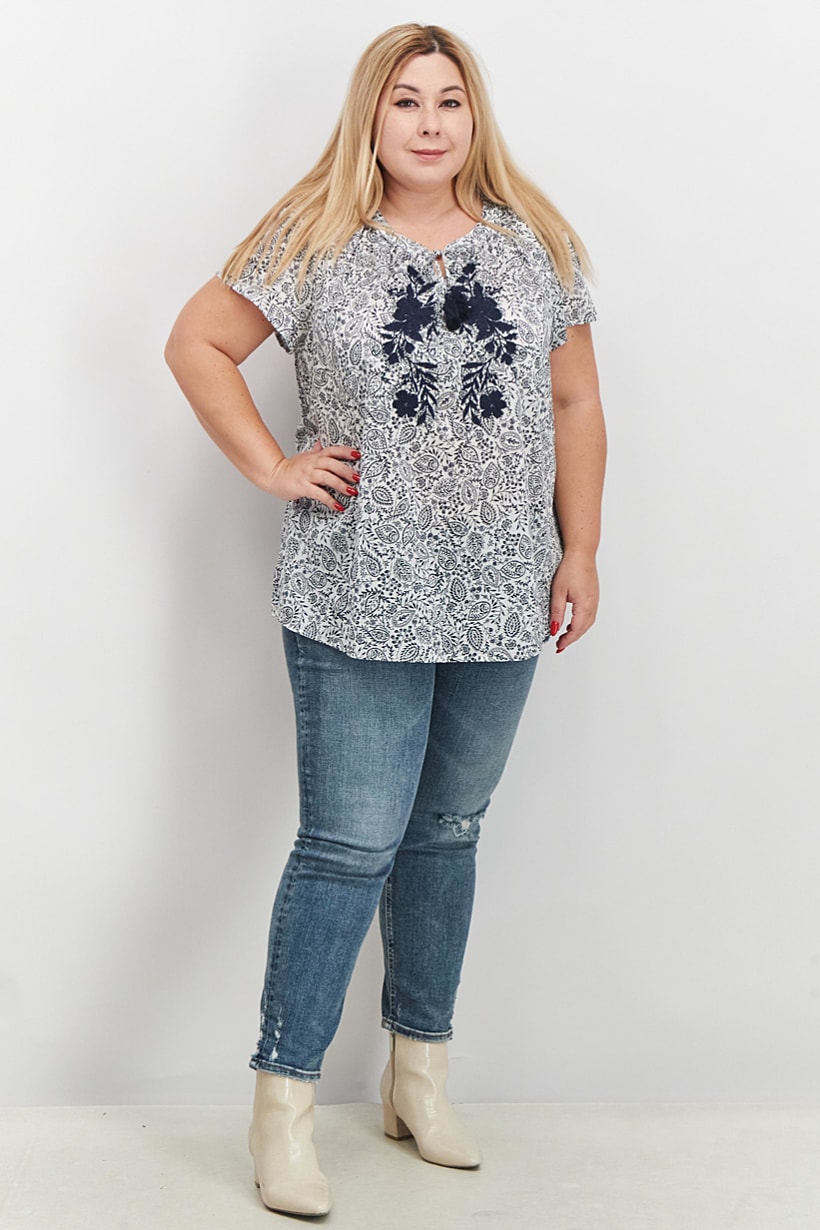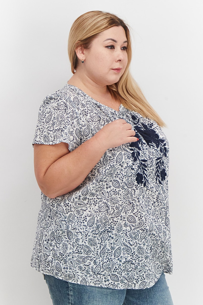 Navy and white floral V-neck top for plus-size women with short sleeves.