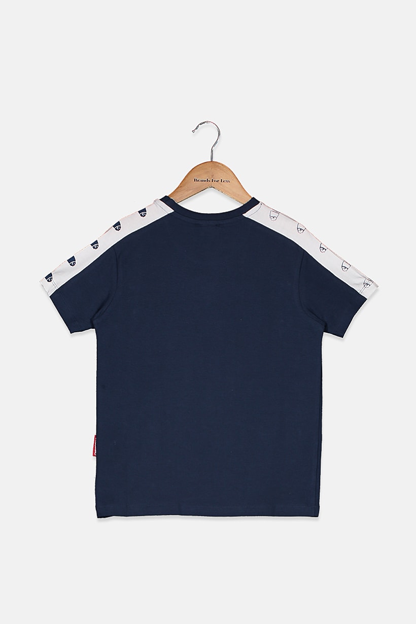 Sleeve Length : Short Sleeve, Type of Hem : Straight hem , Type of Sleeve : Short sleeve , Type of Neckline & Collar : Round neckline , Ideal For : Boys, Care : Machine washable, Occasion : Casual, Pattern & Print : Brand Logo, Types of Closures : Pullover, Fabrics : 5% Elastane, 95% Cotton, Color Family : Navy Blue,