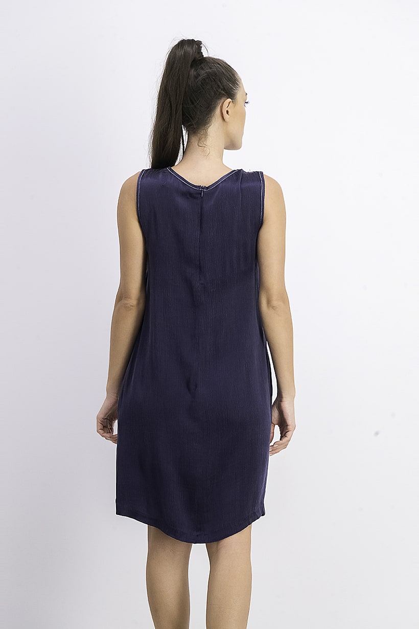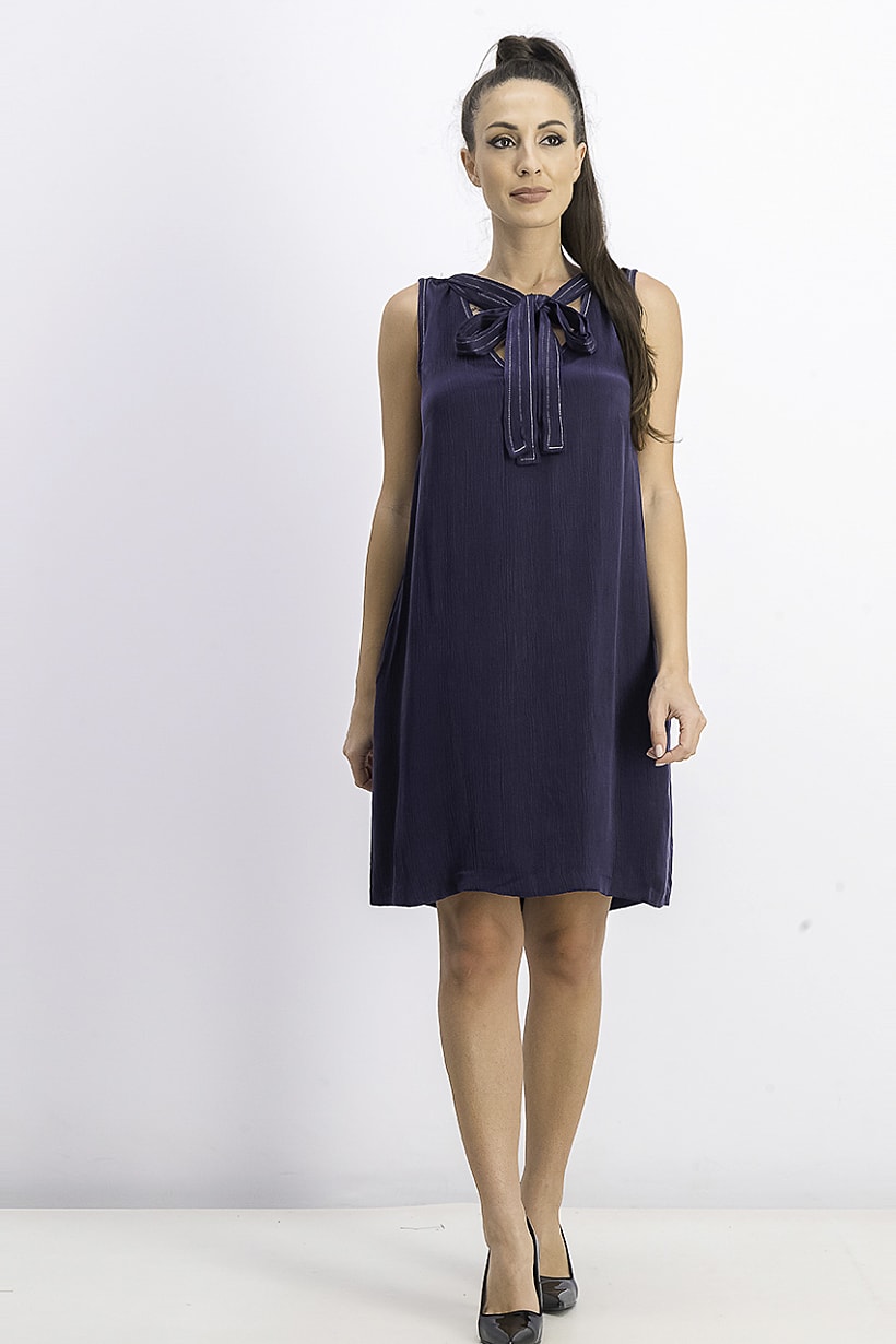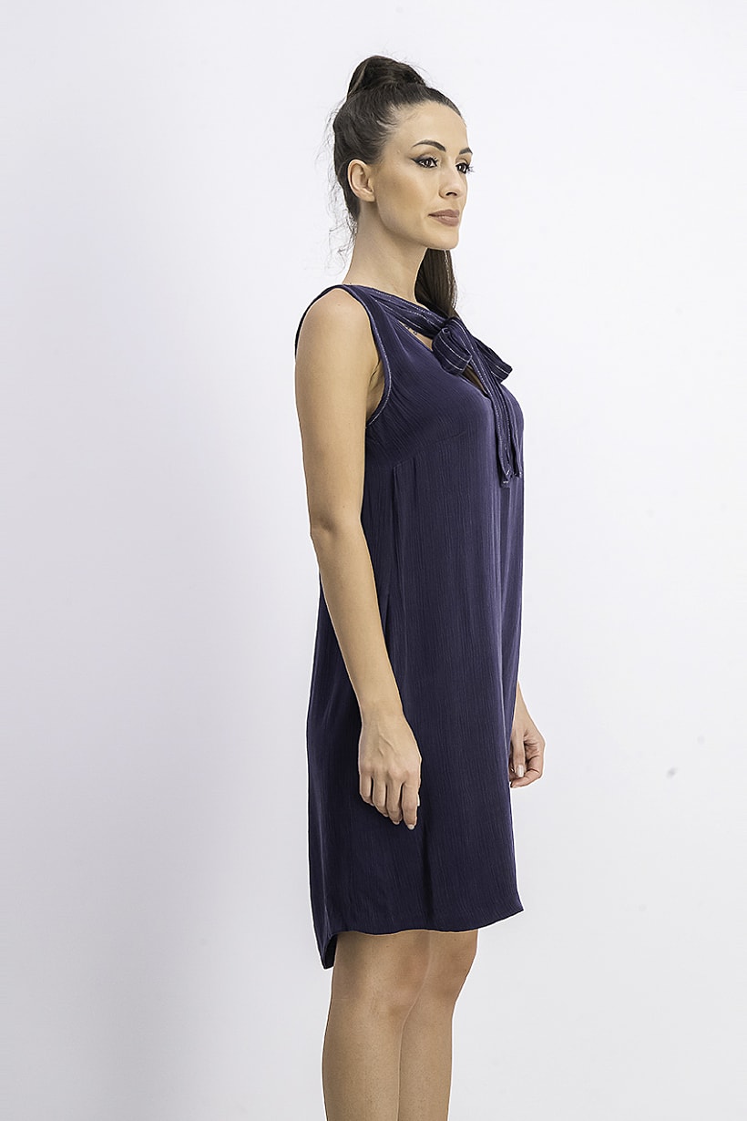 | descriptionOriginal | Disclaimer : Product color may slightly vary due to photographic lighting sources or your monitor settings., Ideal For : Women, Fabrics : 31% Viscose, 69% Cotton, Care : Machine washable, Pattern & Print : Textured pattern, Types of Hem : Straight hem, Types of Closures : Pullover, Types of Sleeve : Sleeveless, Color Family : Navy Blue, Types of Neckline & Collar : Tie neckline, Dress Style : Sheath, Occasion : Casual, |