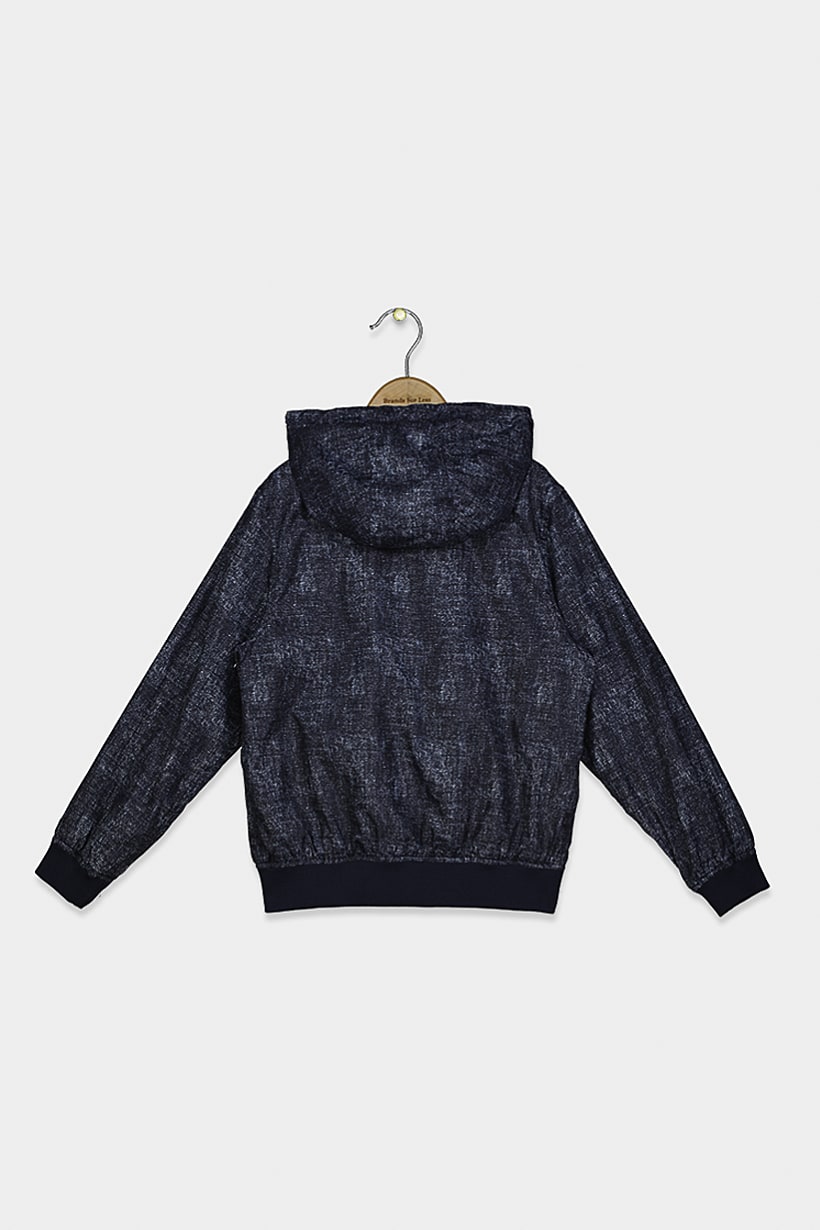 Navy Blue Printed Hooded Windbreaker for Boys.