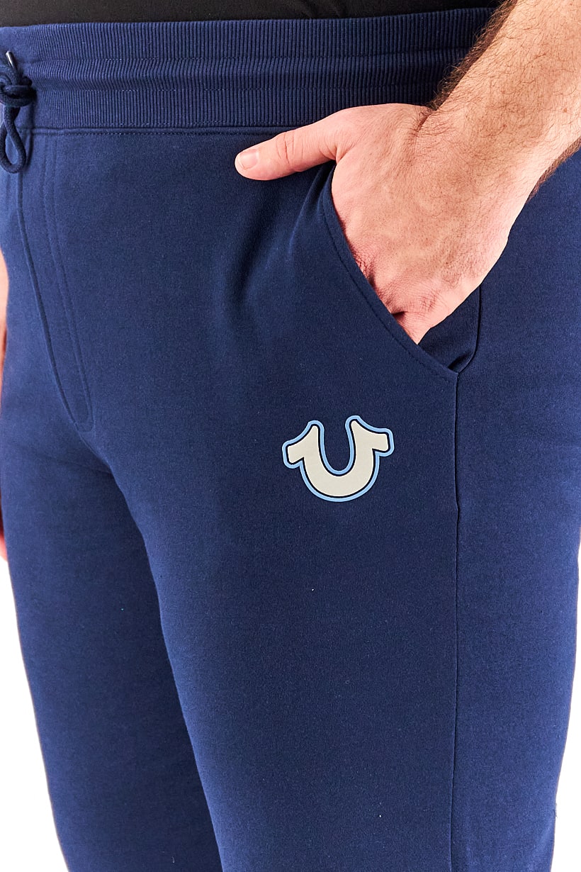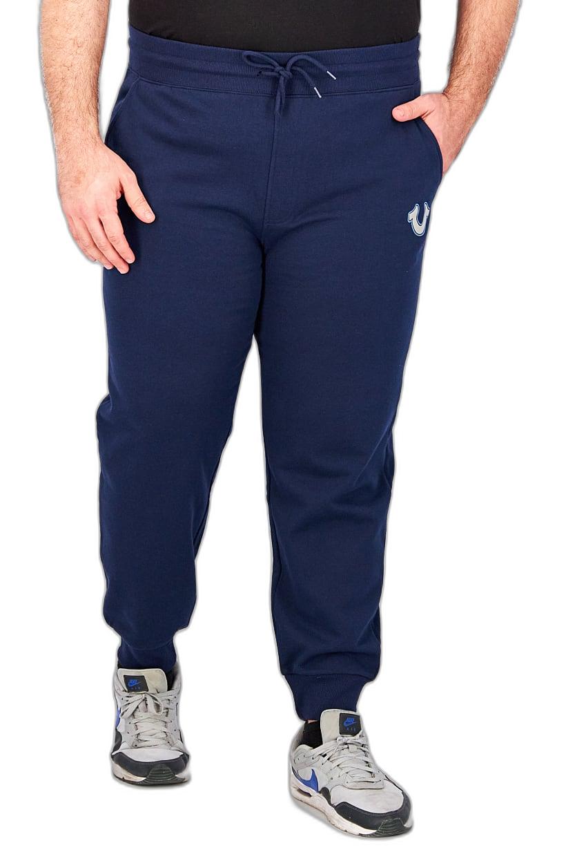 This product is suitable for men and has a regular fit. It is a pair of jogger pants with a mid-rise and a drawstring closure. There are three pockets, including side pockets, and the fabric is a blend of 60% cotton and 40% polyester. The pants have a textured pattern and graphic print in navy blue. Please note that the product color may vary slightly due to lighting or monitor settings. It is machine washable and ideal for casual occasions.