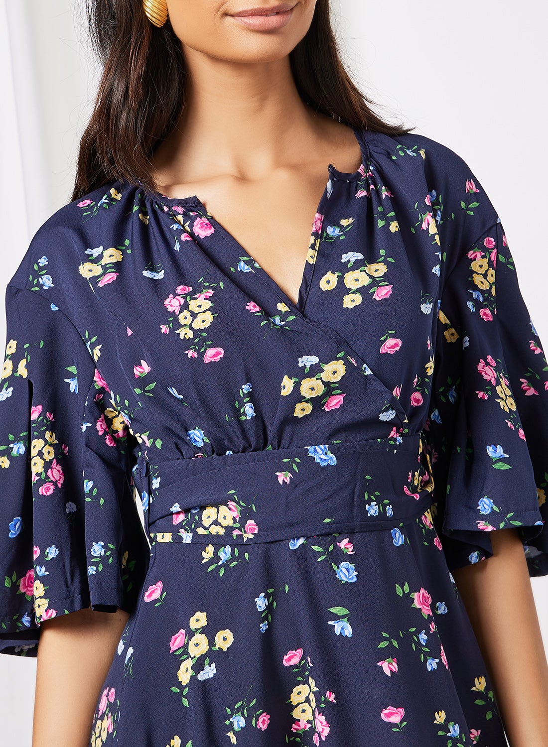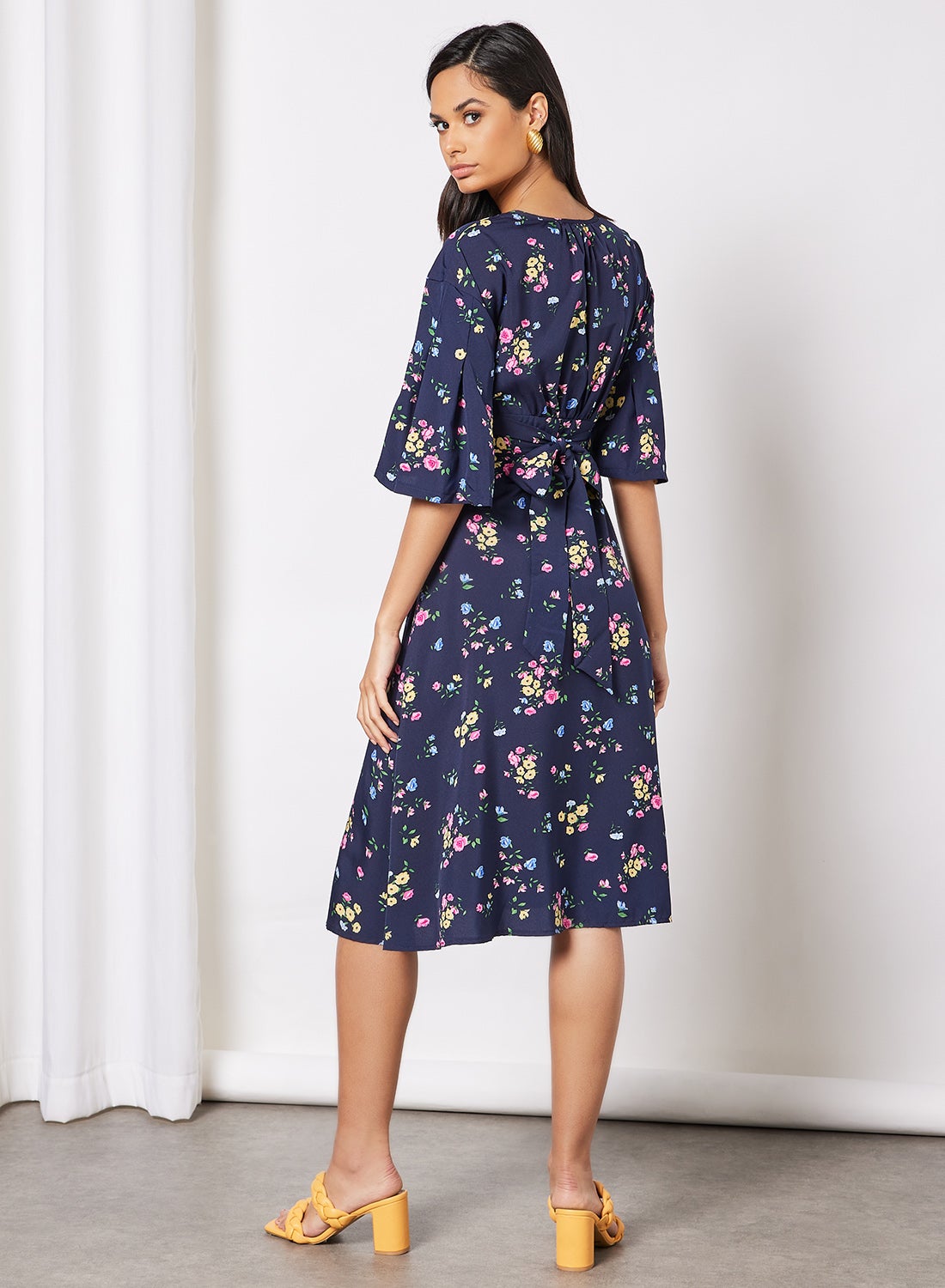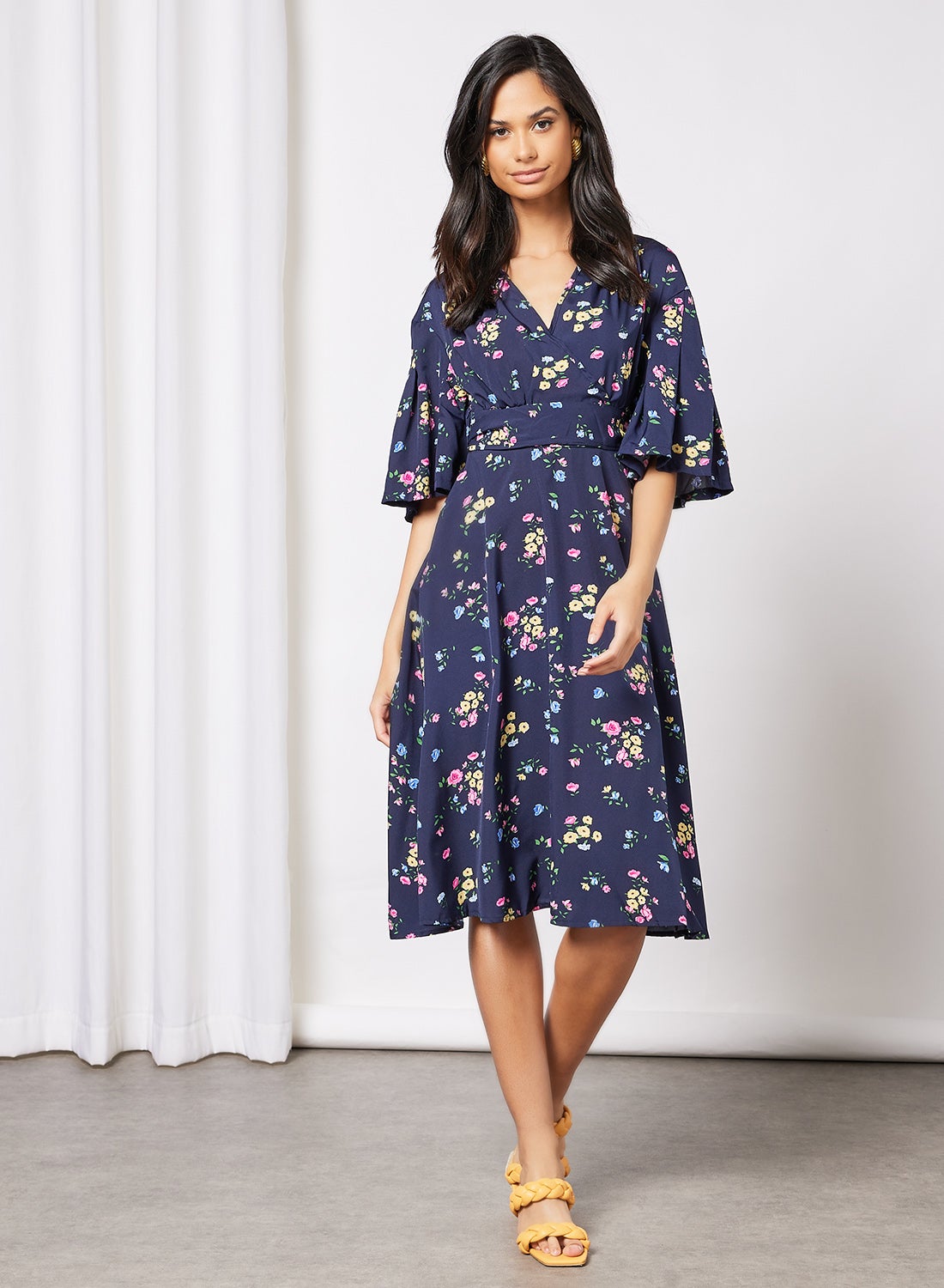 | nameOriginal | Casual Flared Bell Short Sleeve Knee Length Belted Wrap Dress With V-Neck Printed Pattern Navy Blue |