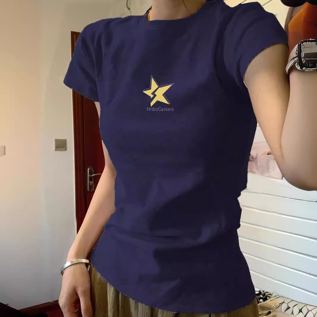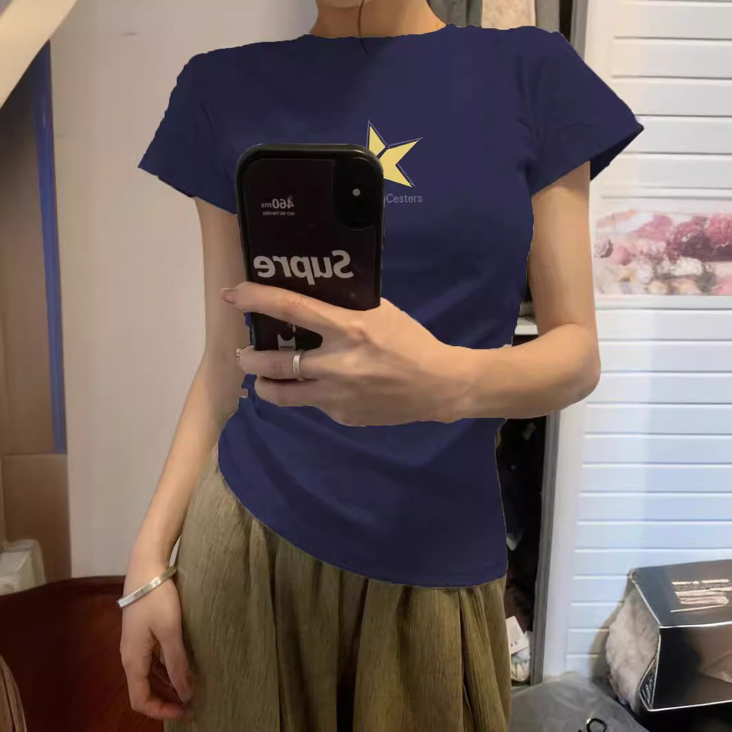 | nameOriginal | navy blue Shoulder T-shirt Women's 2024 Summer Short-sleeved Design Niche Slim-fit Slimming Sweet Spice Girl Short Top |