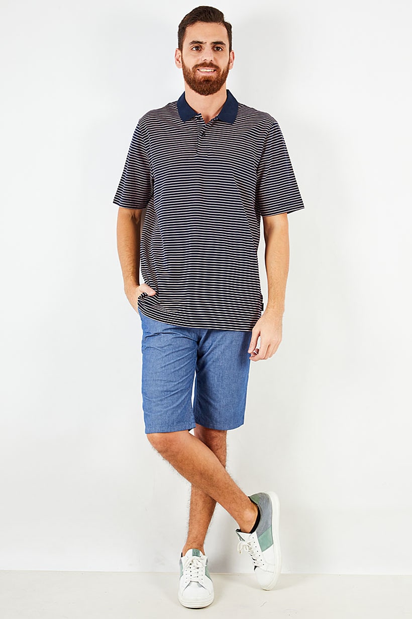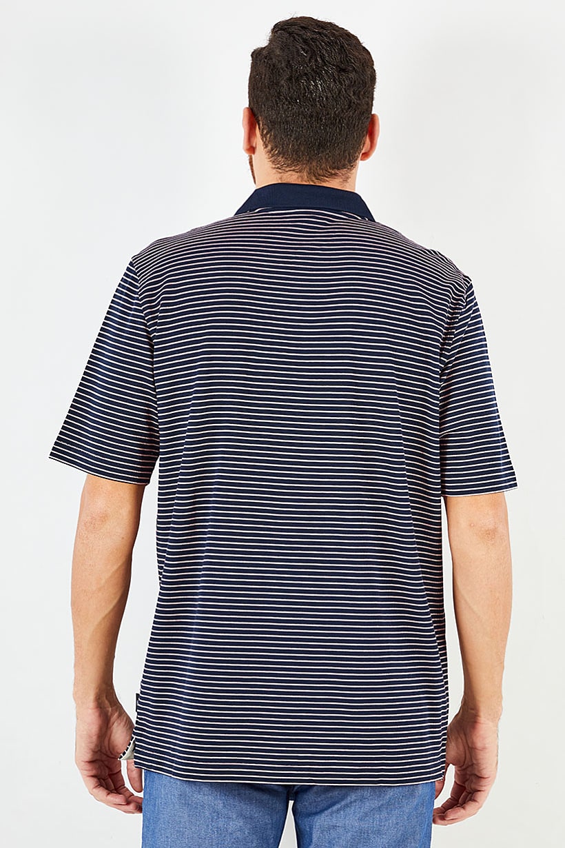 Navy Blue Striped Polo Shirt for Men with Regular Fit and Short Sleeves.