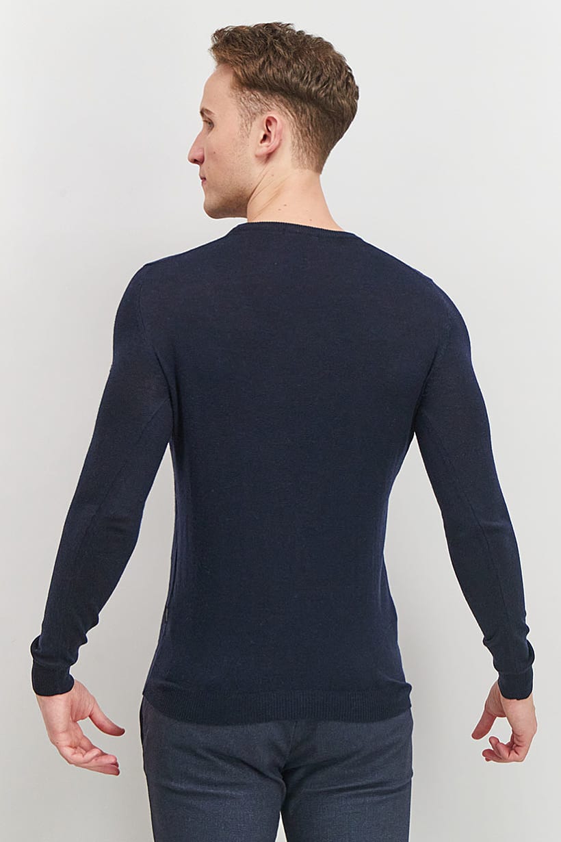 This product is easy to care for as it is machine washable. The size shown is in international sizing and it features long sleeves with a crew neck sweatshirt style. The thickness of the fabric is light and the neckline and collar are both crew style. Please note that the product color may vary slightly due to lighting or monitor settings. The fabric is made of 85% viscose and 15% nylon with a textured pattern. It has a pullover closure and comes in a navy blue color family.