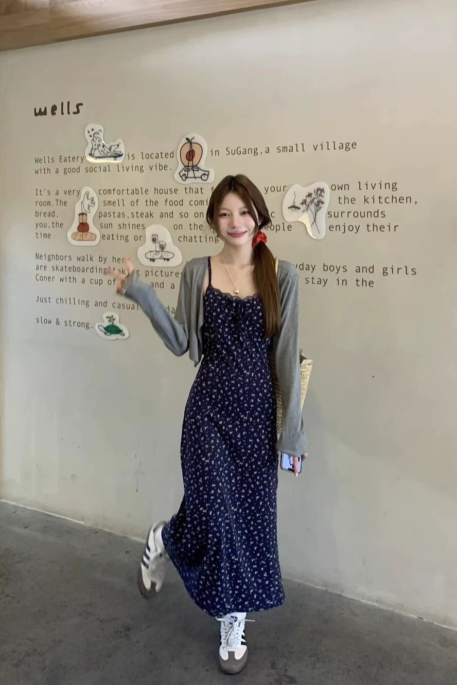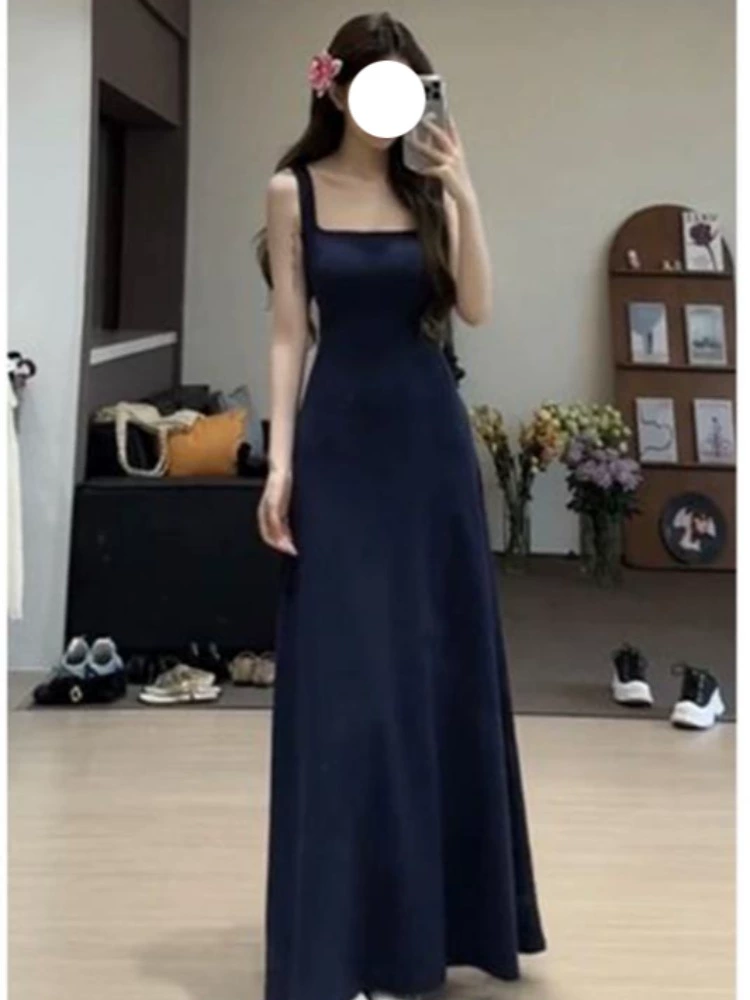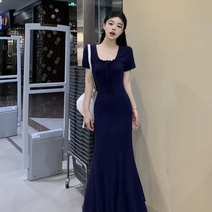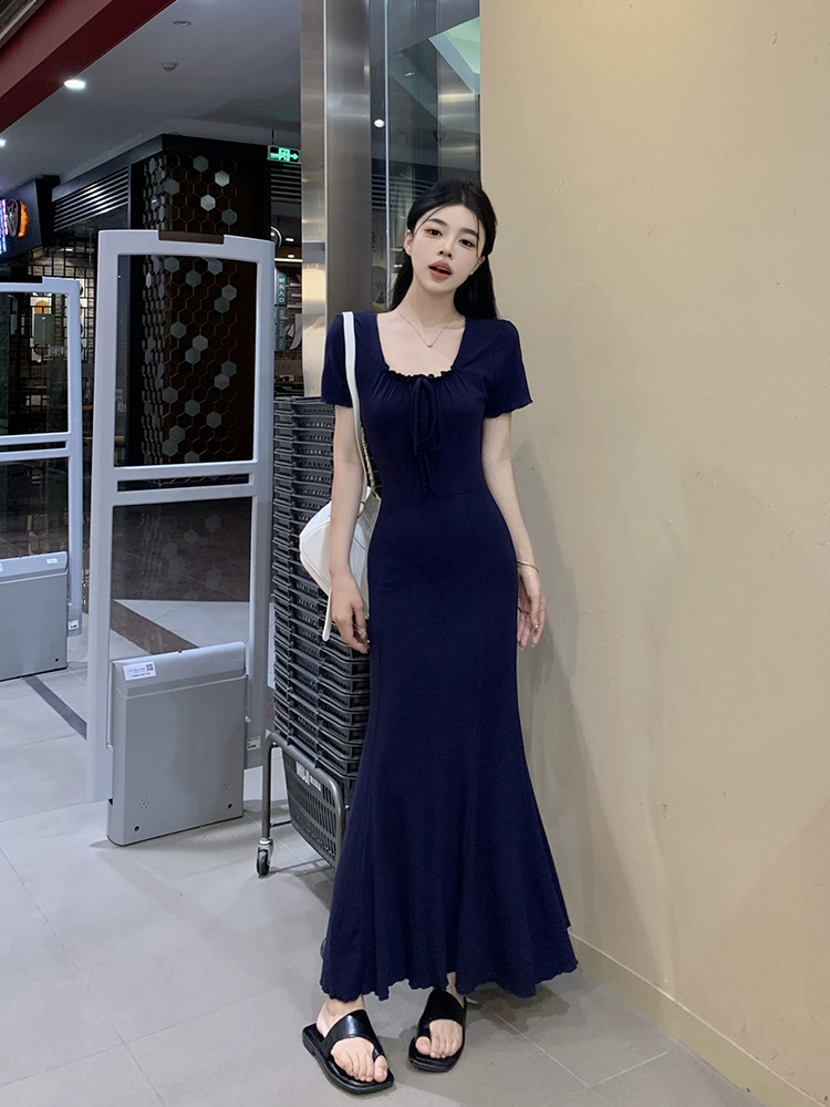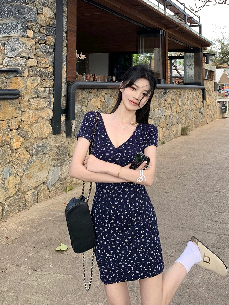 Navy blue V-neck summer slim-fitting short-sleeved dress