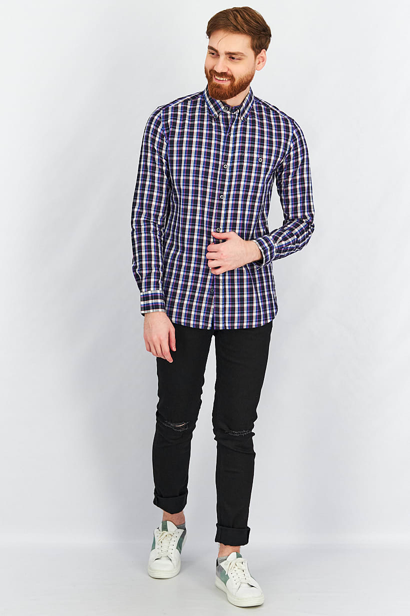 | descriptionOriginal | Care : Machine washable, Fit : Regular fit, Size shown : International, Sleeve Length : Long Sleeve, Types of Hem : Straight hem, Disclaimer : Product color may slightly vary due to photographic lighting sources or your monitor settings., Fabrics : 100% Cotton, Occasion : Casual, Pattern & Print : Checkered, Types of Closures : Button, Color Family : Navy Blue, Types of Neckline & Collar : Button down collar, |