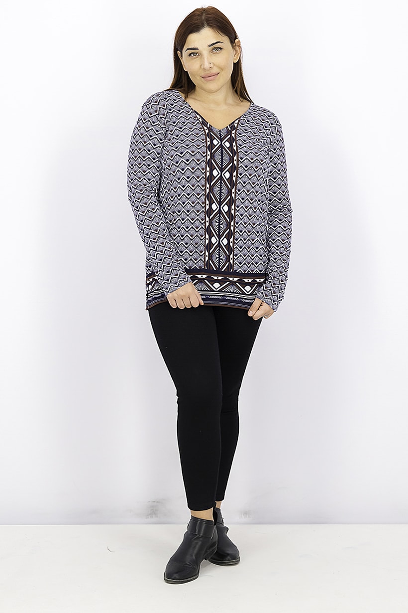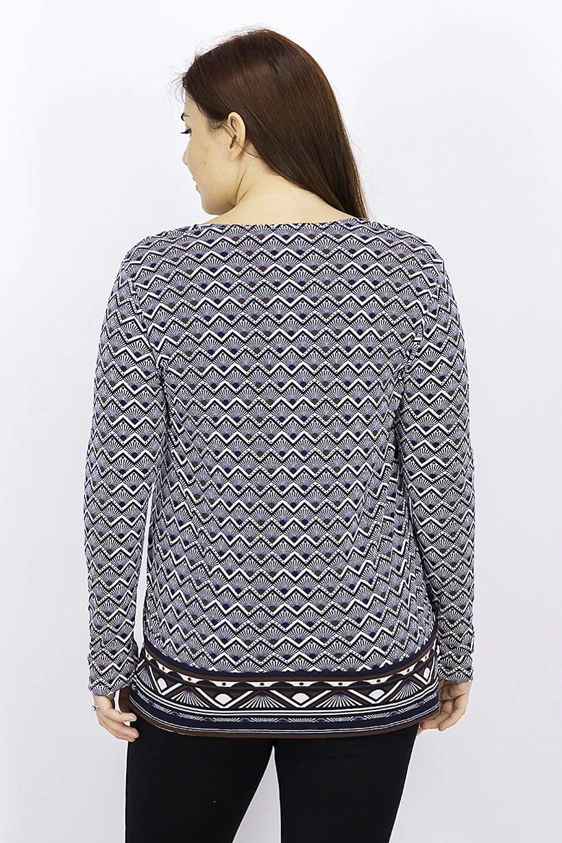 Care : Machine washable, Fit : Regular fit, Ideal For : Women, Size shown : International, Top Style : Blouse, Types of Hem : Straight hem, Types of Neckline & Collar : V-neckline, Types of Sleeve : Longsleeve, Disclaimer : Product color may slightly vary due to photographic lighting sources or your monitor settings., Fabrics : 95% Polyester, 5% Spandex, Occasion : Casual, Pattern & Print : Allover print, Types of Closures : Pullover, Color Family : Navy Blue,
