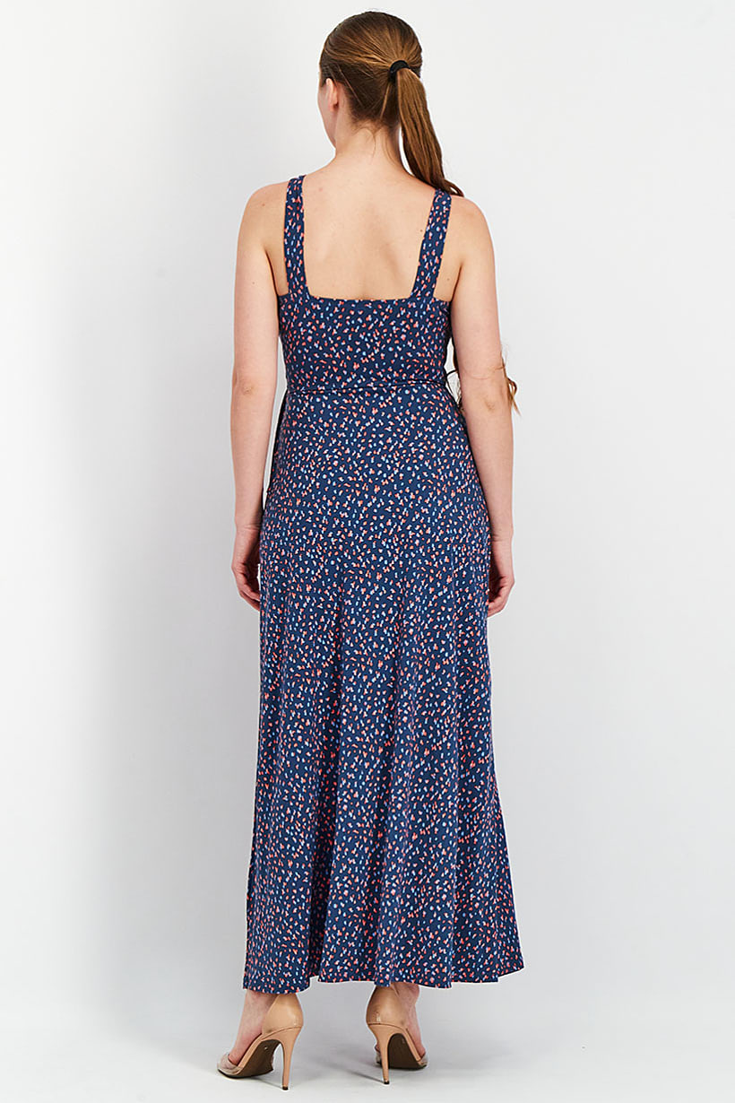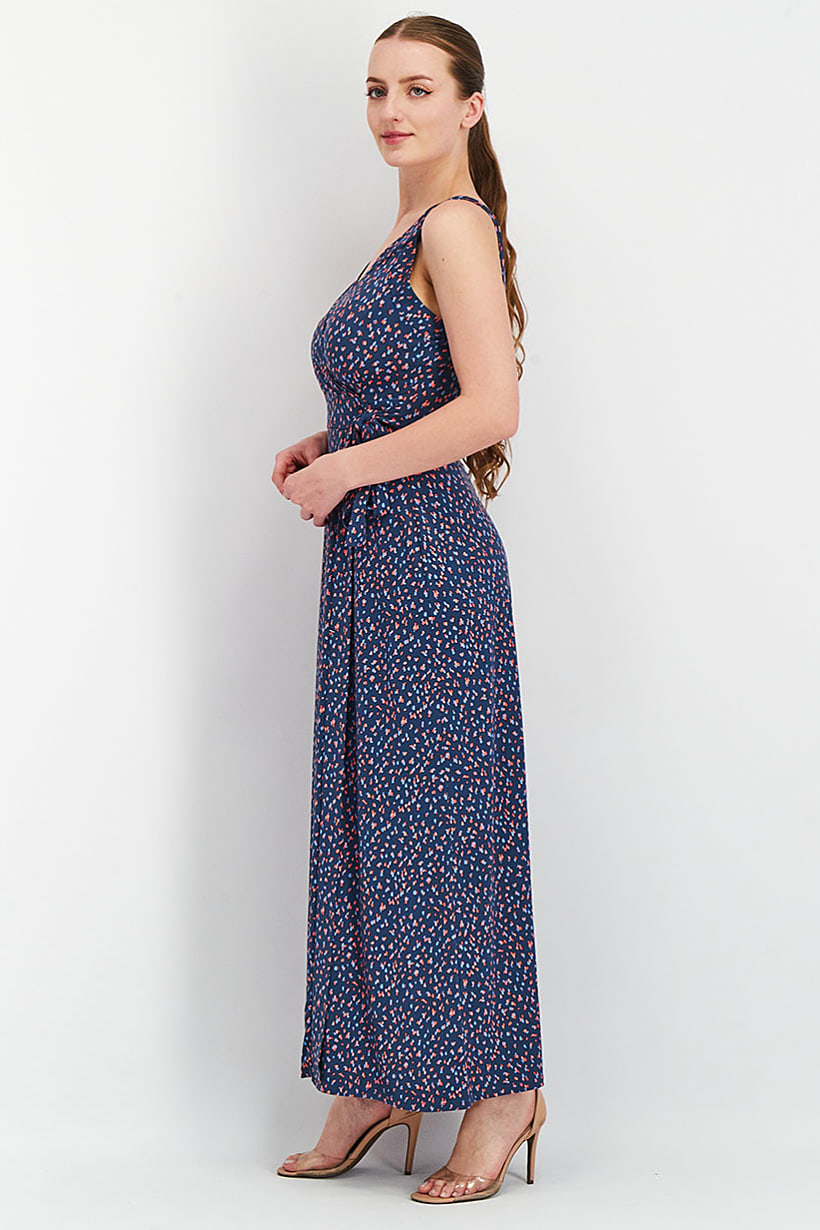 Care : Machine washable, Dress Style : Maxi, Fit : Petite, Ideal For : Women, Size shown : International, Types of Hem : Straight hem, Types of Neckline & Collar : V-neckline, Types of Sleeve : Sleeveless, Disclaimer : Product color may slightly vary due to photographic lighting sources or your monitor settings., Fabrics : 95% Polyester, 5% Spandex, Occasion : Casual, Pattern & Print : Allover print, Types of Closures : Pullover, Color Family : Navy Blue,