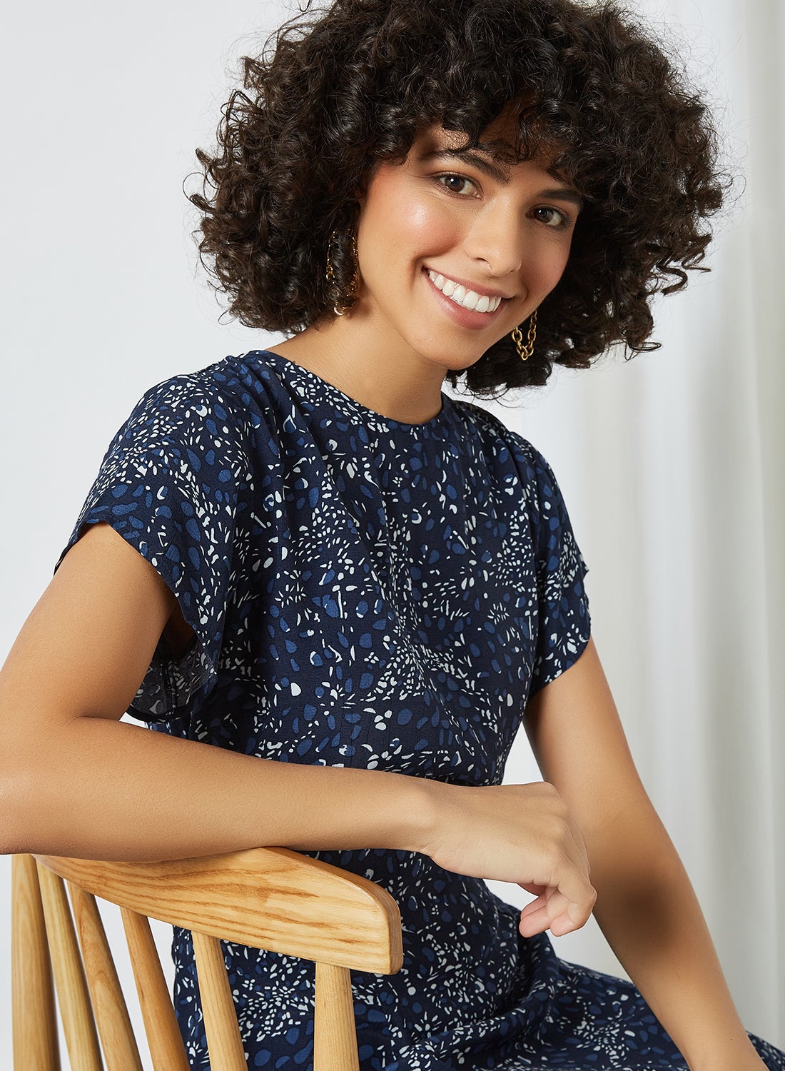 Achieve a relaxed style by pairing it with sneakers. This product features a round neckline, short sleeves, and an all-over print design. It also has an open back and a side slit for added flair. Made of 100% viscose, it is recommended to follow the care label instructions when washing.